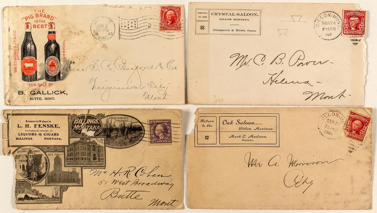 Lot of four. 1) Fantastic 3/4 full photo pictorial from L. H. Fenske Liquors and Cigars. Billings. Envelope is in rough condition. 2) 1904 Crystal Saloon in Dillon. 3) 1904 Club Saloon in Dillon. 4) 1903 pictorial The "Pig Brand" of Butte. For sale by B. Gallick. Two bottles are Basque Pale Ale and old Guiness beer. (Svoboda Collection) City: State: Montana Date: c1904 HWAC# 30941