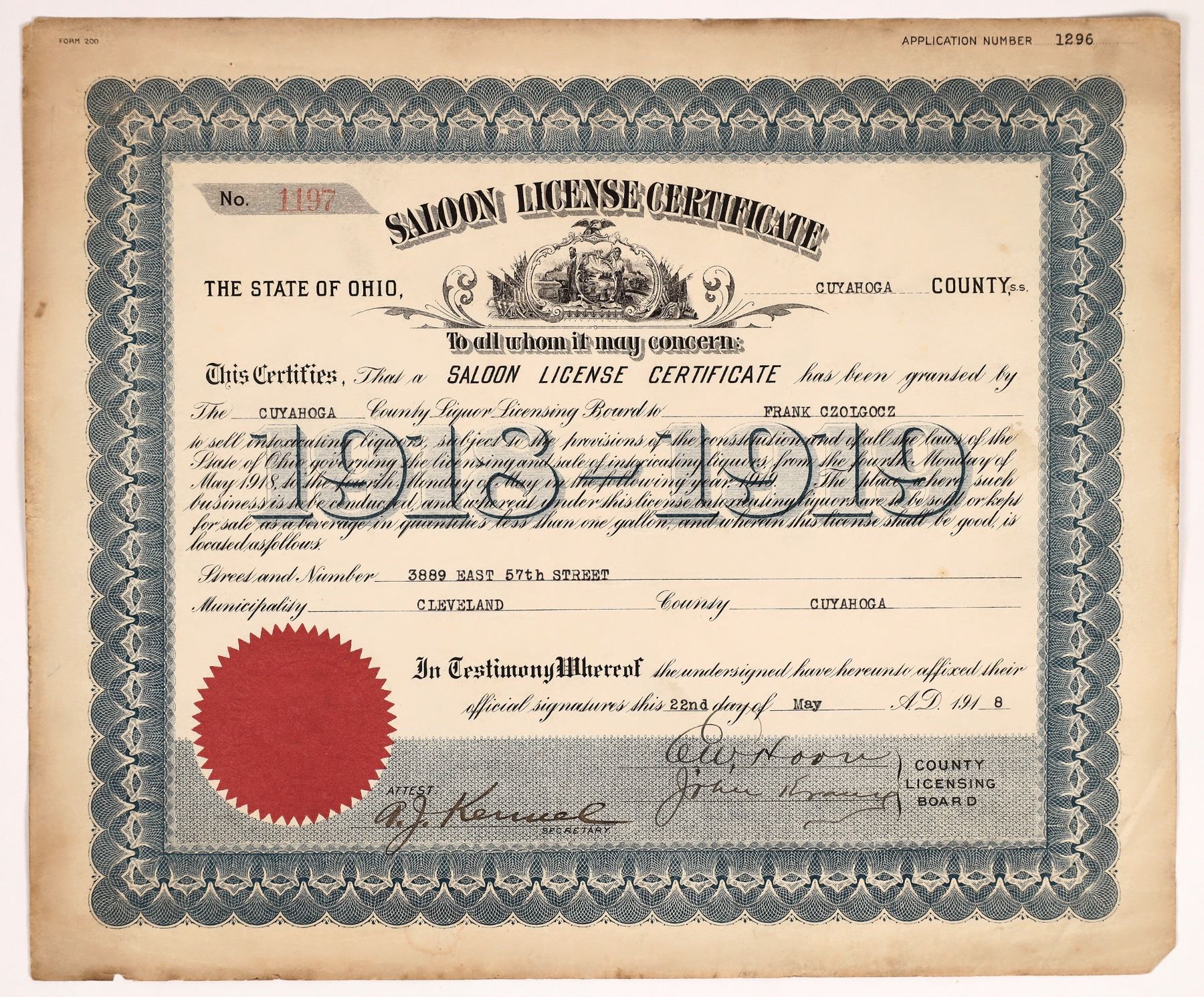 No. 1197. Issued to Frank Czolgocz at 3889 East 57th Street in Cleveland. Allowing him to sell intoxicating liquors and beverages in quantities less than a gallon. Signed by the county licensing board. Blue border, black print, and red seal. 10 x 12" Creases, soiling around edges. Just before Prohibition. Ohio Cleveland 1918 Ken Prag Collection