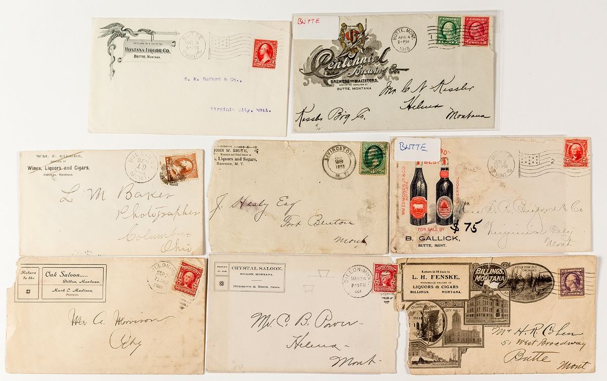 1) John W. Smith, liquors & segars, Bozeman, Montana Territory. Opened roughly at let. Affects corner advertisement. 2) 1885 Eilers wines, liquors and cigars, Bozeman, Montana Territory. 3) 1901 Montana Liquor Company of Butte. 4) Centennial Brewing Company of Butte. 1918. Fancy ad. 5) Fantastic 3/4 full photo pictorial from L. H. Fenske Liquors and Cigars. Billings. Envelope is in rough condition. 6) 1904 Crystal Saloon in Dillon. 7) 1904 Club Saloon in Dillon. 8) 1903 pictorial The "Pig Brand" of Butte. For sale by B. Gallick. Two bottles are Basque Pale Ale and old Guiness beer. City: State: Montana Date: 1888-1918 Inventory# 40063