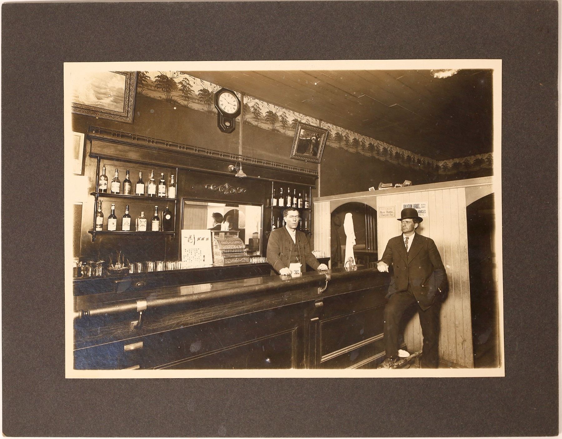Framed B/W photo inside a saloon. Shows Daytion Bros. King City on wall behind patron. Look close those bottles behind the bar are in focus I.E.; J.H. Cutter, High Life. Framed w/ white border. Excellent condition.