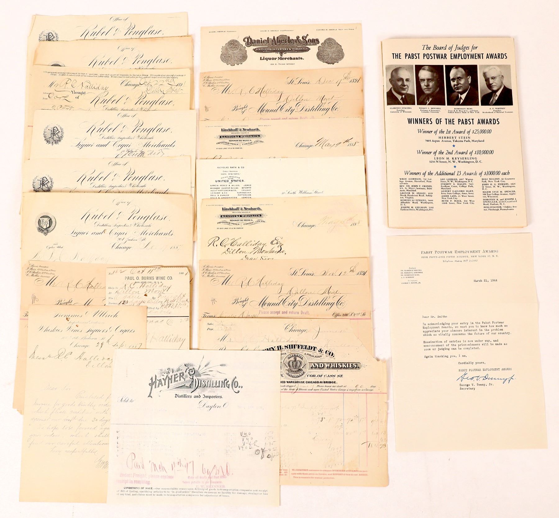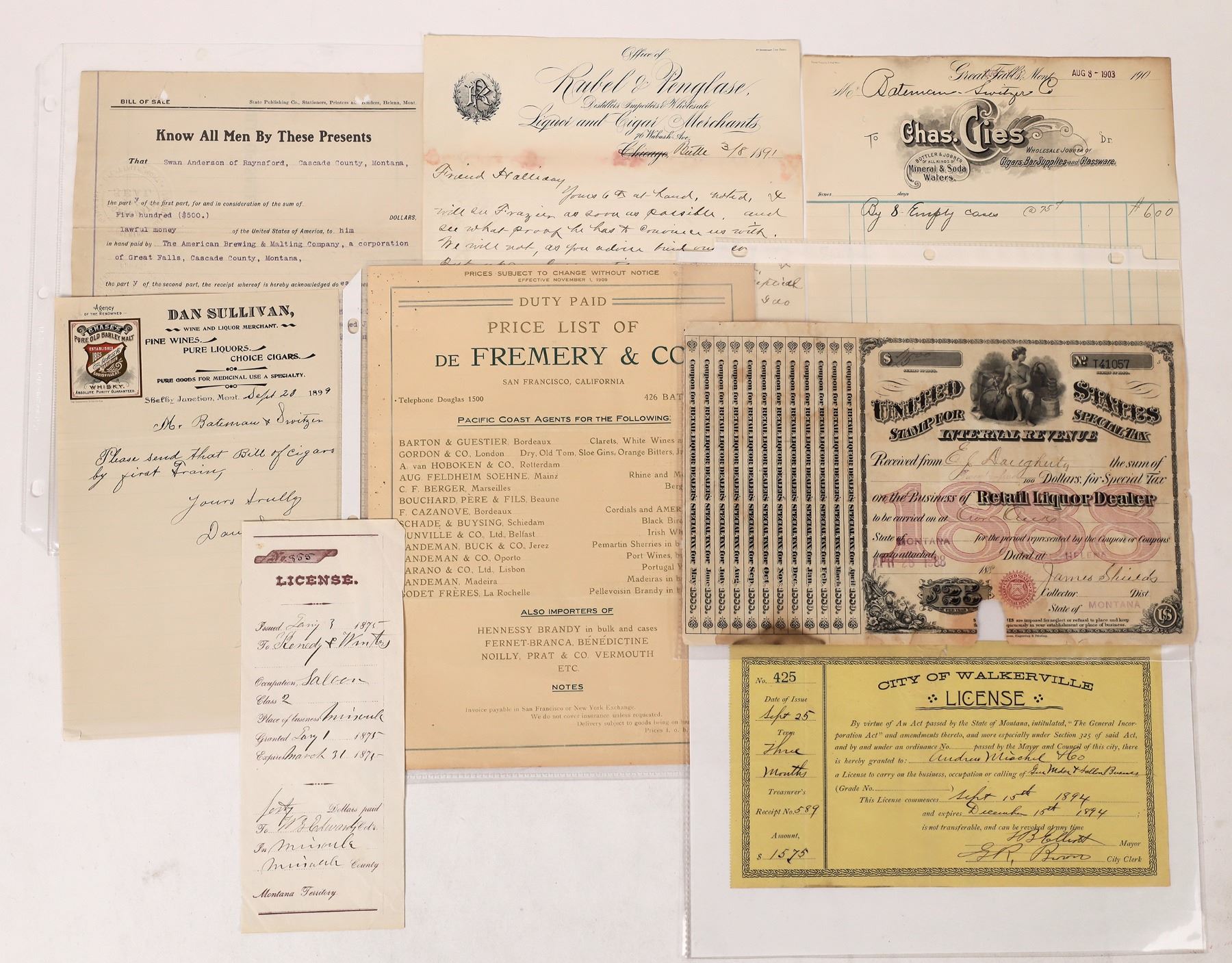 Lot of twenty-three. Includes 1) City of Walkerville license for Andrew Machel(?) & Co. 1894. 2) 1875 License to Kennedy & Winters for saloon in Missoula. 3) 1888 United States specialty tax. 4) Price list from Fremery & Co. of San Francisco for a variety of wines and liquors. 5) Sale from the American Brewing & Malting Company for two black geldings named Tom and Jetty. 1911. Raynsford. 6-22) Billheads for Chas. Gies of Great Falls, Dan Sullivan of Shelby Junction, Rubel & Penglase of Butte, and a variety of letterheads from other states selling liquor to Montana. c1880-1910