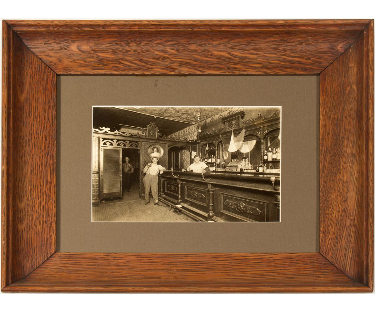 Framed 7 x 5" picture in a 13 x 10 1/2" frame. 3 men in the photo with a Buffalo Brewing tray on the wall at the end of the bar.