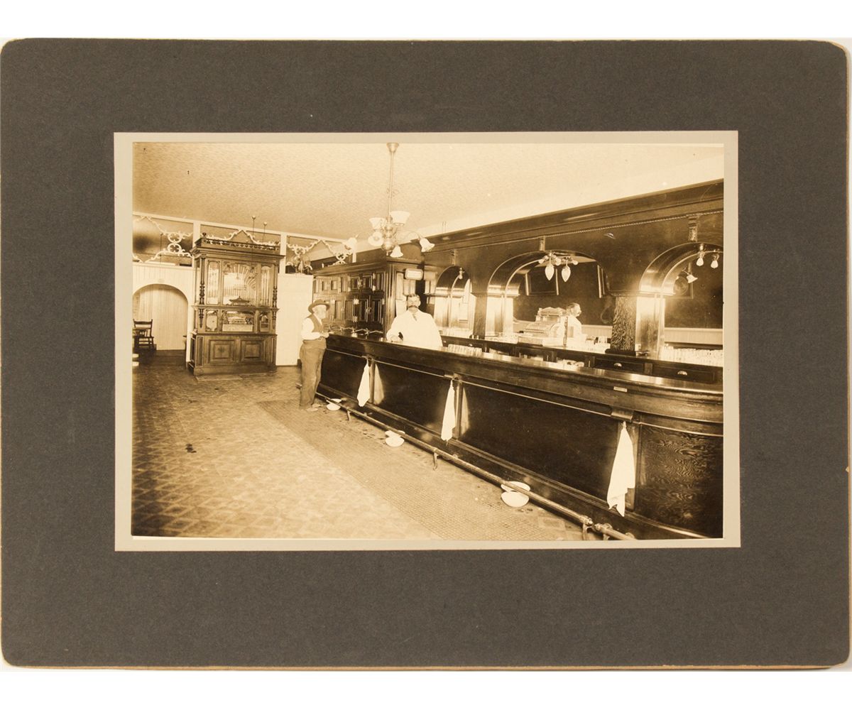 Two men at the bar, with nickelodeon at the end of a long bar. 8 x 6 1/2" photo in an 8 x 10" mat.