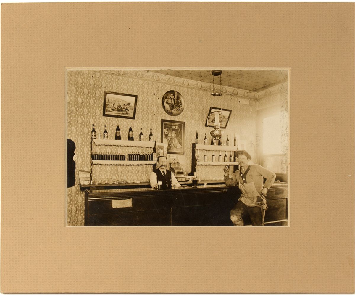 9 x 10" matted of 2 men at bar, beer tray and artwork in background.