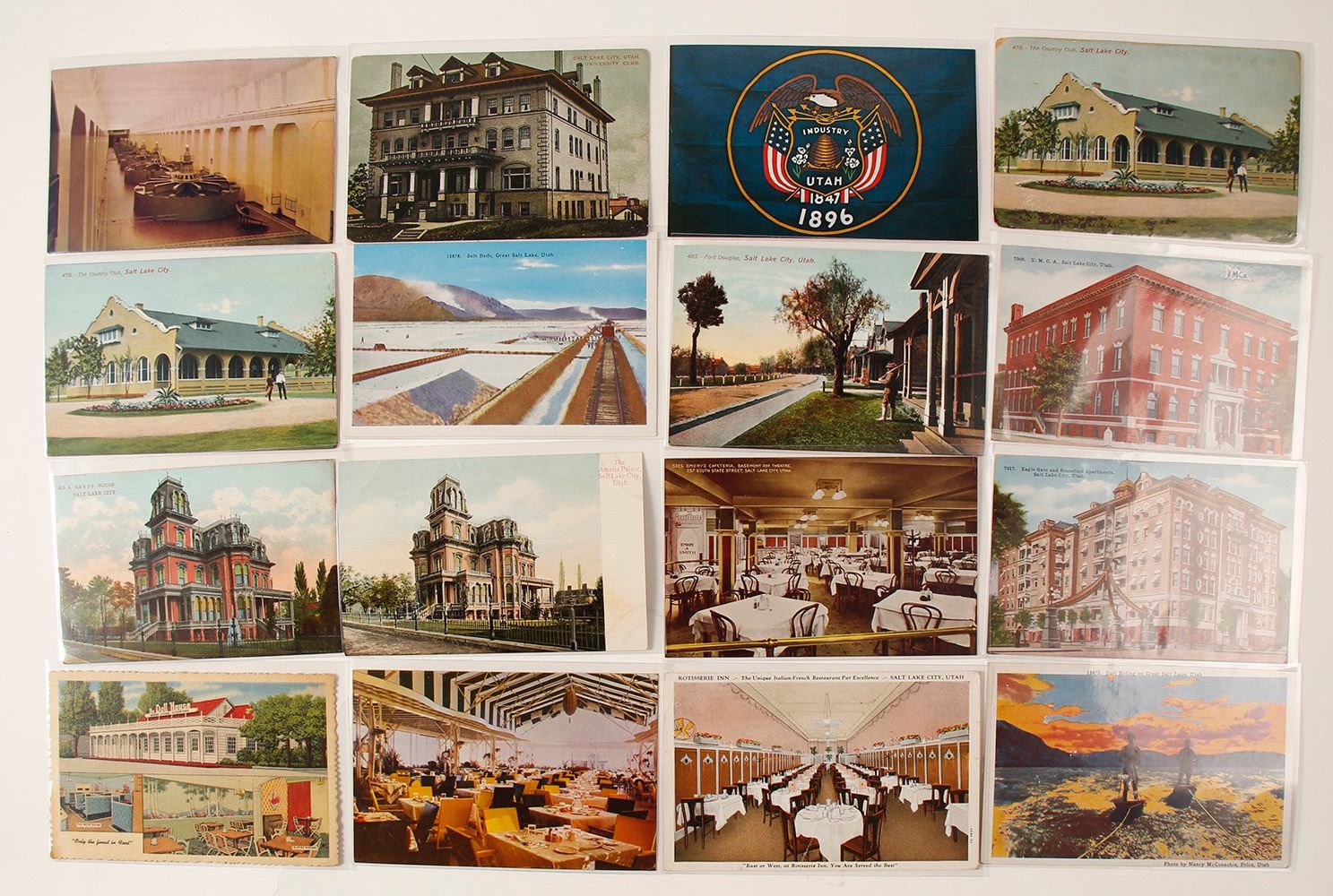Lot of 75 cards including 7 real photo. Real photo include: women posing at Black Rock Beach; first house built in Utah at Temple Square; three of the same monument; entrance to Memory Park; and Triassic Reptile exhibit at Utah Museum of Natural History. Rest of the collection includes early printed cards and some later pieces. Highlights: interior of Onyx Bank Bar; interior of Schramm's, the Great Prescription Drug Store; Keith O'Brien Company, Salt Lake's Largest Department Store; exterior to the Alta Club; early 1902 of the Salt Palace; and much more! 25 were mailed, 1902-1951. Please inspect! (Prag Collection) Date: Location: Salt Lake City, Utah HWAC# 55449