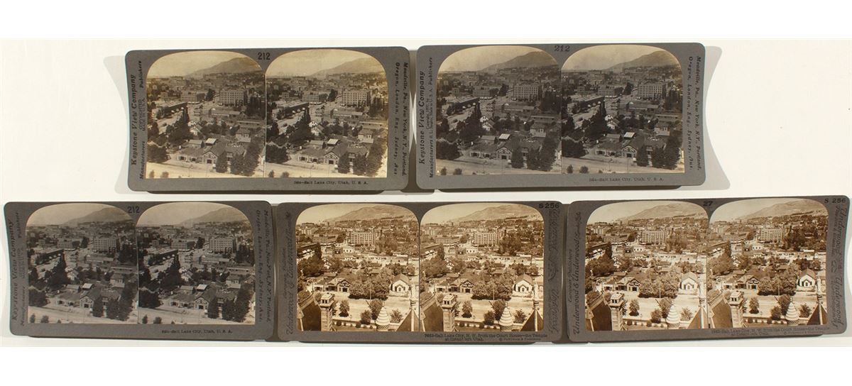 Five stereoviews, two different. From Underwood & Underwood, a duplicate pair of stereoview No. 7653. Salt Lake City, N.W. from the Court House--the Temple at distant left, Utah. Good contrast. From Keystone View Company, three copies of No. 2454. Almost the same view as the Underwood, with the Mormon Temple in the back left. Good condition. (Prag Collection)