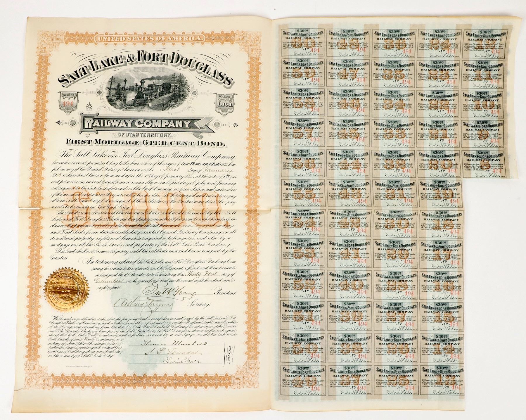 Lot of (1) large $1000 First Mortgage 6% Bond certificate. Issued by the Salt Lake & Fort Douglass Railway Company, of Utah Territory. This full sheet bond has a nearly full sheet of coupons attached, good for $30.00 each, due in 1893/1894. The certificate has a great central vignette, and a gold embossed corporate seal at the base. Beautiful piece, in excellent condition. Extremely rare. See photos.