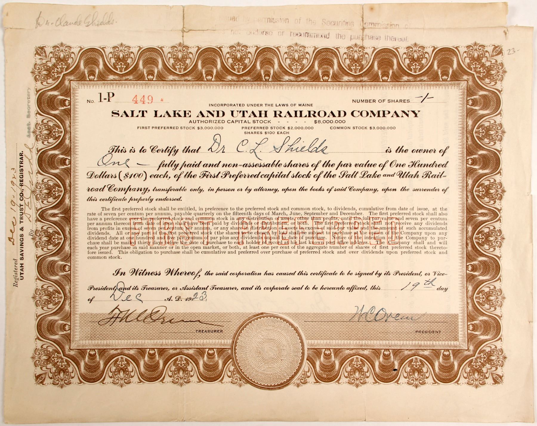 I/U unlisted #449 CL Shields 1 share 1923 signed by President illegible. "The Salt Lake & Utah Railroad ran from Payson to Salt Lake City. The line was built in 1914 as an electric interurban. On April 3, 1914 it reached as far as Pleasant Grove. By 1916, the line reached Payson. It was unofficially called the "Orem" after A. J. and W. C. Orem, who arranged the corporate financing to build the line. When the line was constructed as far as Provo, special-built new cars began running. They were dark red, thirty-six passenger capacity cars, each divided into a freight compartment and two passenger compartments, smoking and non-smoking. Each car was heated, lighted and powered by four 110-horsepower Westinghouse motors, which drew electricity from overhead cables. The Salt Lake & Utah Railroad also carried the United States mail and newspapers. Other freight included milk and produce along with regular every day commodities. A spur in Pleasant Grove ran to a loading station under a dumping ramp where ore and fire clay were loaded. The clay came from natural deposits on the hills east of town, mined there in two locations, the Homer/McFarland and the Wadley pits. The ore was hauled from mines in American Fork Canyon. Ridership was lively before the family car became popular in the mid 1920s. During the depression, and through WWII when gas was rationed, people again patronized the convenient rail system, which, due to its deterioration, was referred to as "The Red Heifer" or "Leaping Lena". The line was closed in 1946, just after the war." from utahrails.net. Creases, corner missing, small tears. Prag Collection State: City: Date: 1923 HWAC# 84174