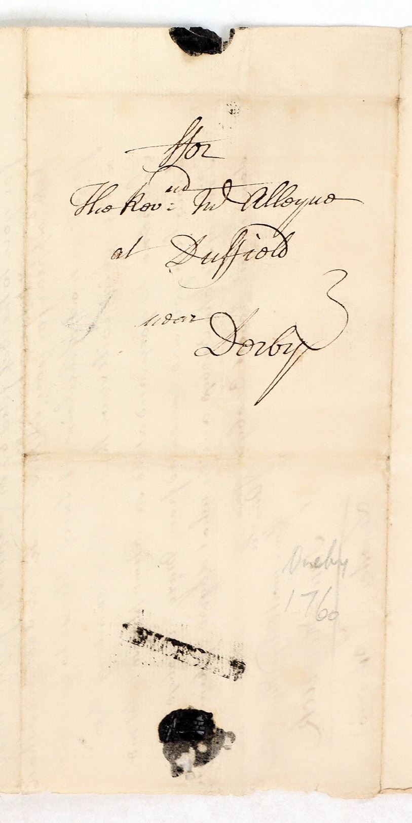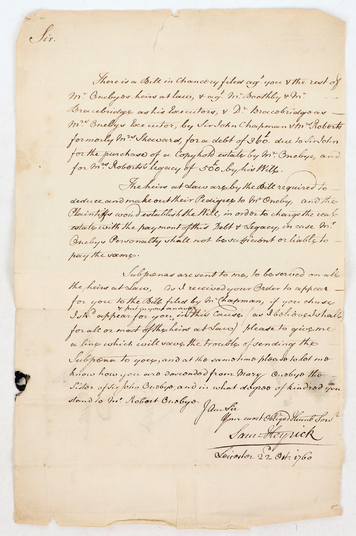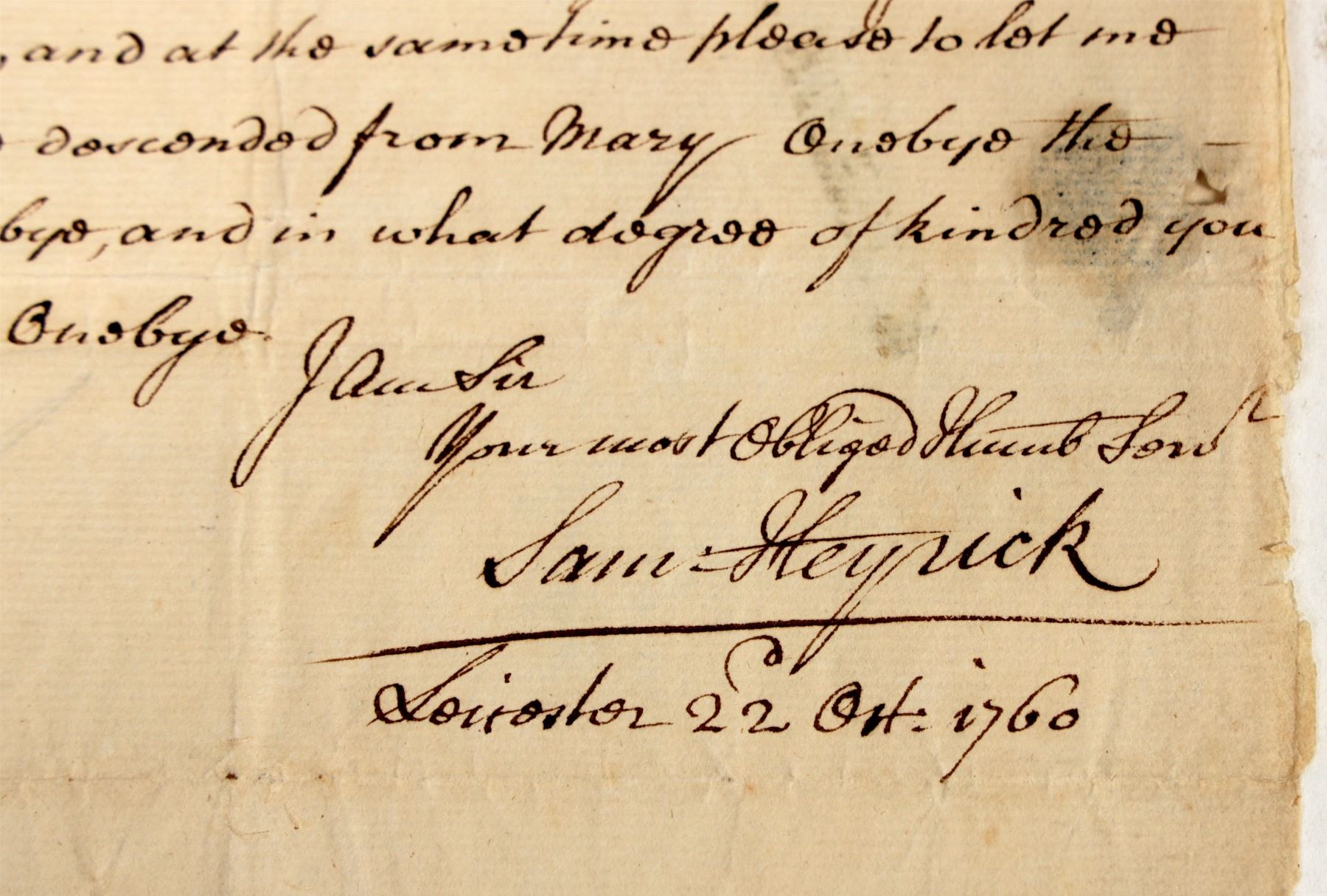 Handwritten letter concerning heirs, executors and the settlement of an estate signed by Sam Heyrick, Leisester, 22 Oct. 1760. Folded in the middle, entirely legible; 8 x 12 inches if you unfold it.