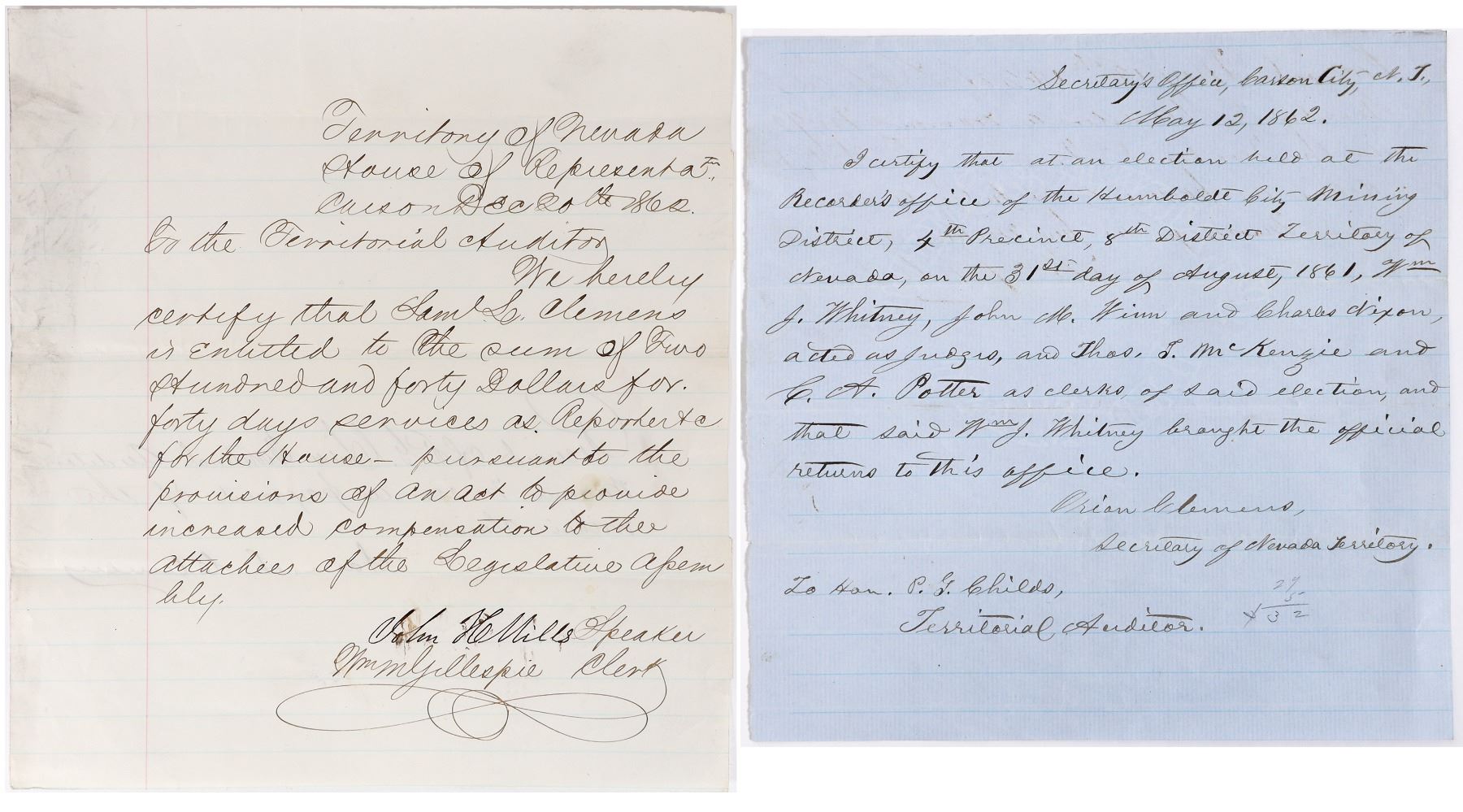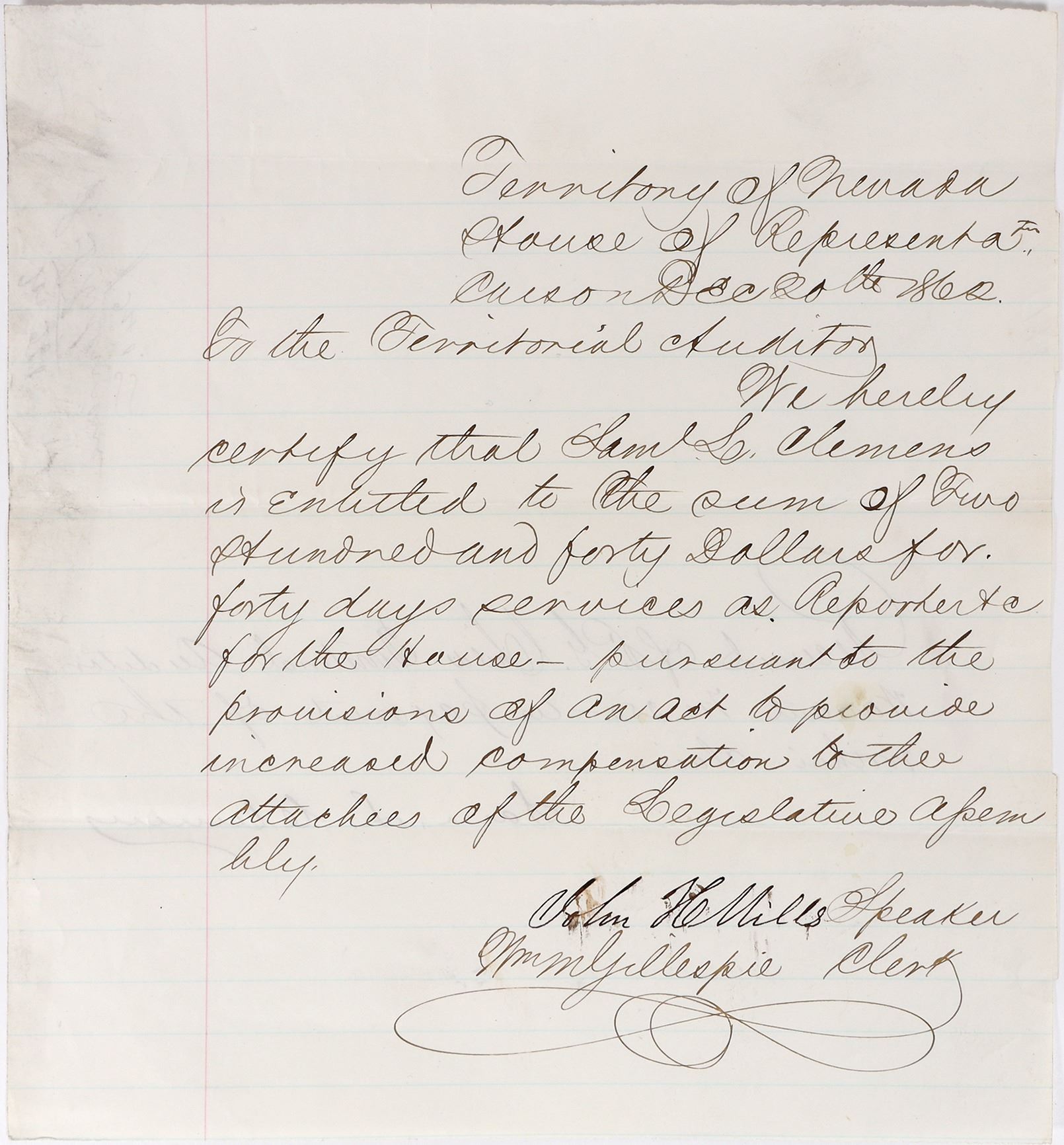 The original Territorial warrants including the actual warrant (check) issued to Sam Clemens had long disappeared by the time a small cache of documents was found in a cubbyhole of the Carson City in 1967. This original document, the authorization to the Controller to issue a pay document is the only document known regarding Sam Clemens’ service as a news reporter and copy assistant during the 1862 Legislative session.