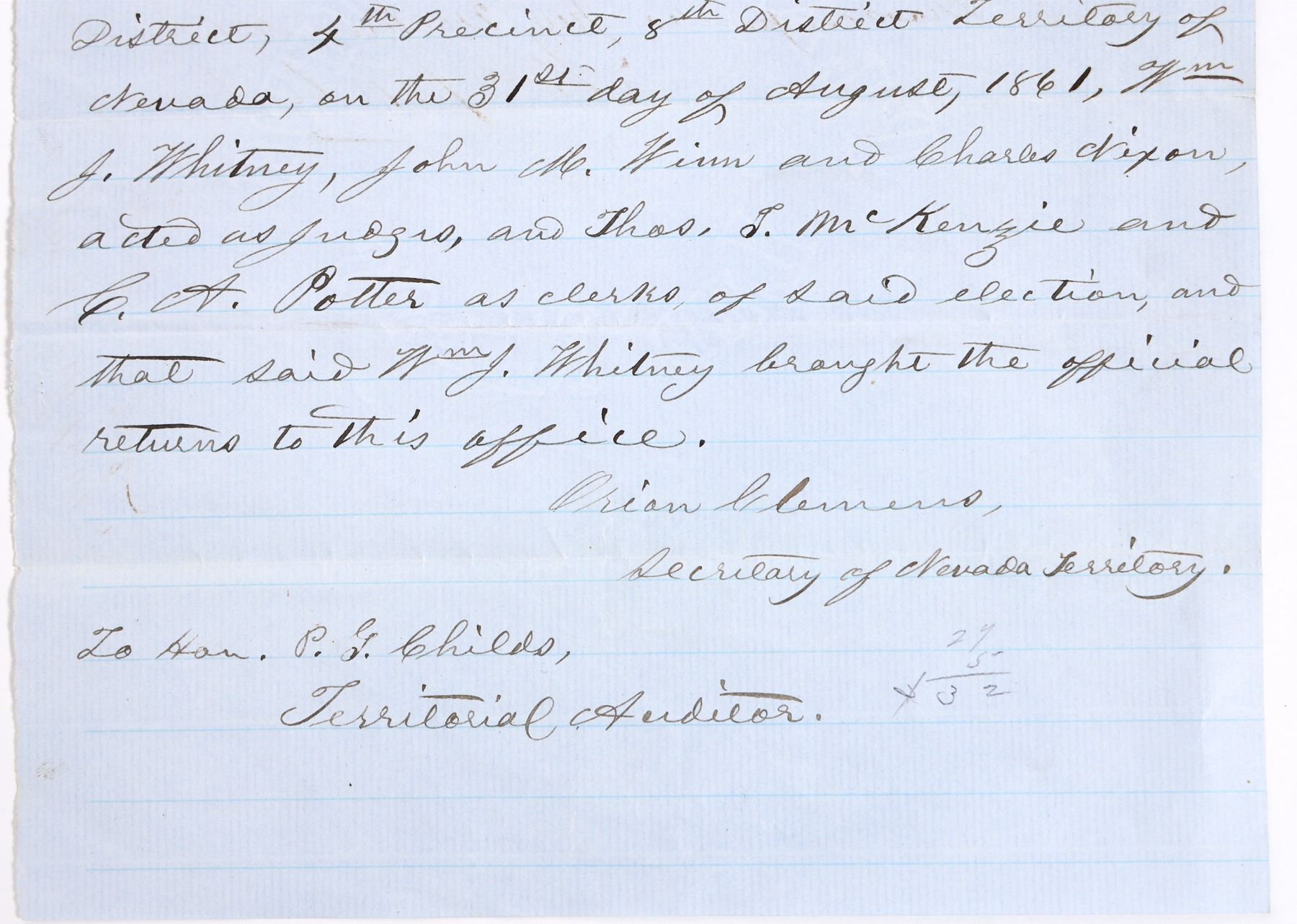 There is very little left of original documents from the early part of Sam Clemens’ life in Nevada. His various biographers generally ignored his early, pre-literature life—some even getting it completely wrong, including one author in 1911 who argued Clemens never held a position with the Nevada Territorial government. Both Clemens’ multi-thousand page Autobiography , his four volumes of Letters and the writings and editorial notes of Letters From Nevada Territory, 1861-1862 put that argument to rest.