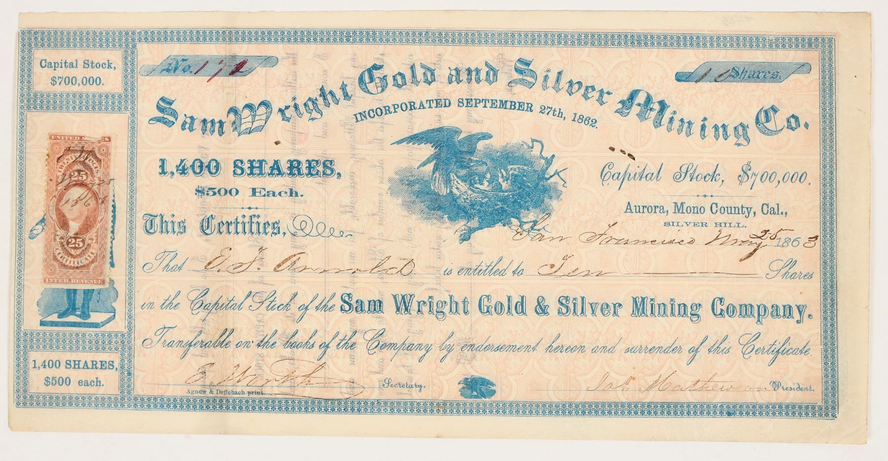 Aurora, Mono County, Cal., Silver Hill (printed above dateline). Inc. Sept. 27th, 1862. No. 171, issued for 10 shares to E.F. Arnold in 1863. Signed by president Jas. Mathewson and secretary E. Worth. Not cancelled. Blue border and print on pink paper. Vignette of George Washington (left) (covered by stamp) and eagle with chicks in nest (center). Printed by Agnew & Deffebach. Folds, pinholes, light wear. 5.25 x 10.5" Probably named after Samuel Cole Wright (September 29, 1842 -July 6, 1906) who was a sergeant in the Union Army during the American Civil War. The company office was at 547 Washington according to 1863 Langley. James Mathewson was an importer of watches. E.F. Arnold was a hay & grain dealer. Not listed in Filer or Holabird indexes.