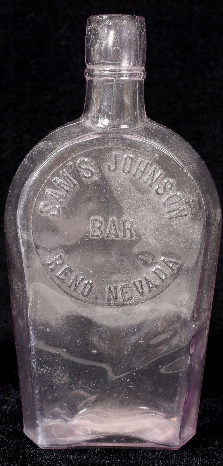 Clear c. 1903-05 pint coffin pocket flask. Sam's Johnson/Bar/Reno, Nevada. Johnson bought part interest in the Assembly Saloon in 1903 on West Street and the Johnson Bar was 2 doors away in Reno. Sam's Johnson Bar is not a misspelling, rather it is consistent with a Johnson Bar, a railroad term, and Sam was the owner. 4 piece mold and tooled top, no net contents embossing. This example featured on page 212 in Holabird Volume 1. No apparent chips or cracks, fine condition. Reno Nevada Fred Holabird Collection