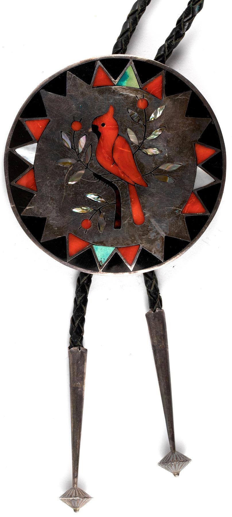 Incredible large round bolo (3" diameter) in coral, mother of pearl, jet, turquoise set in sterling. Image of cardinal in coral Zuni jewelers (husband and wife) create mosaic as well as inlay jewelry. They use many bird and floral designs in their inlay work. Black leather tie with silver tips.