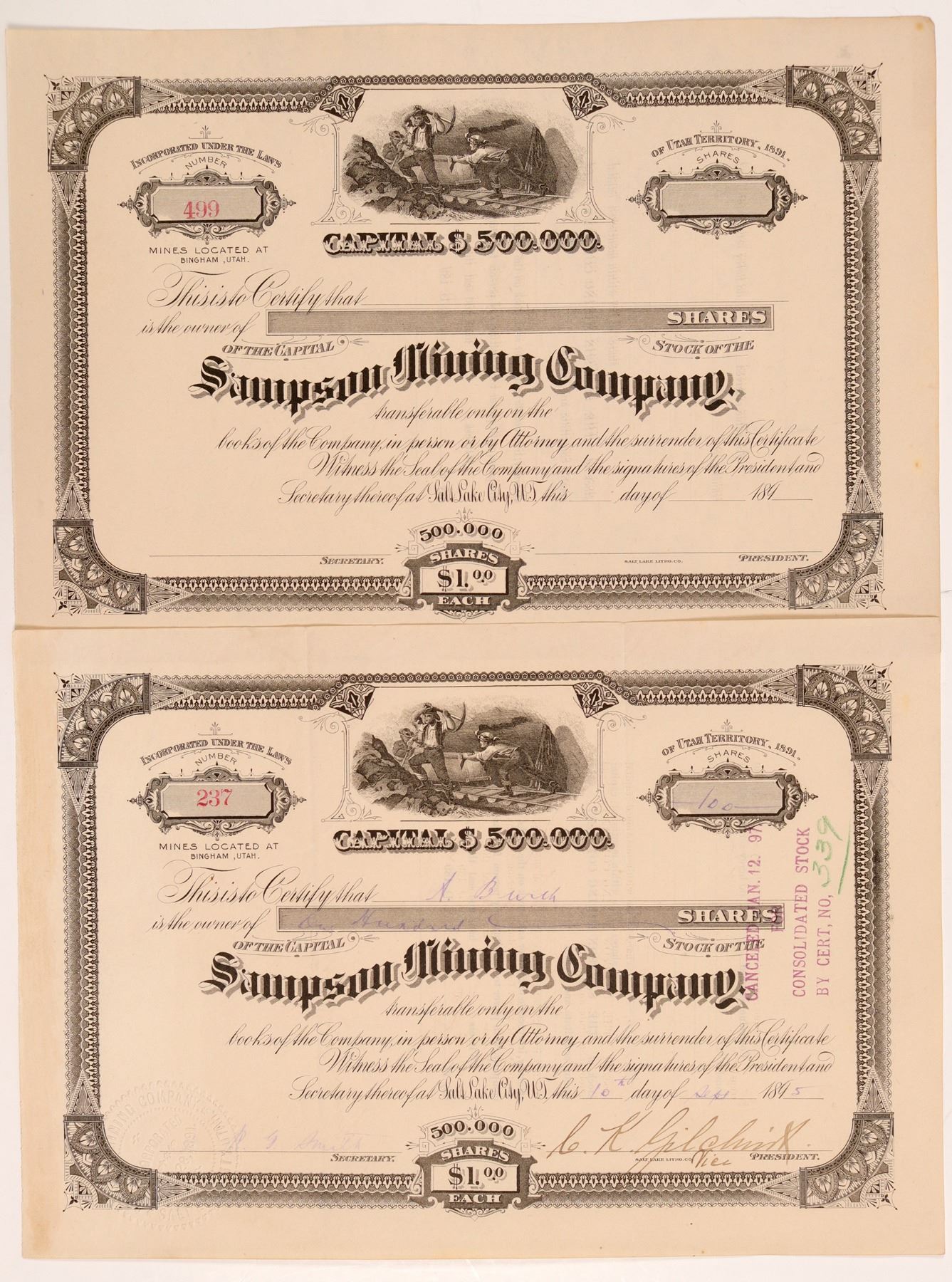 Lot of 2. One issued and one unissued. "Mines Located at Bingham, Utah" printed at upper left. No. 237, issued for 10 0shares to A Burth on Sept. 10th, 1895 in Salt Lake City. Signed by vice president CK Gilchrist and secretary RG Smith. Stamp cancelled. Black border and print, underground mining vignette. Printed by Salt Lake Litho. Co. 7.75 x 11" Folds, toning. According to Financial and Mining Record, Volume 30, the company owned the Sampson Mine at Bingham, a large producer of silver lead ores. Ore had to be shipped up a hill to send it to the lead mill via a tramway. The company is building new tramway track (1891, pg. 95). Engineering and Mining Journal, Volume 63 (1897) reports that the company has bought the Yosemite No. 2 mine. Ken Prag Collection