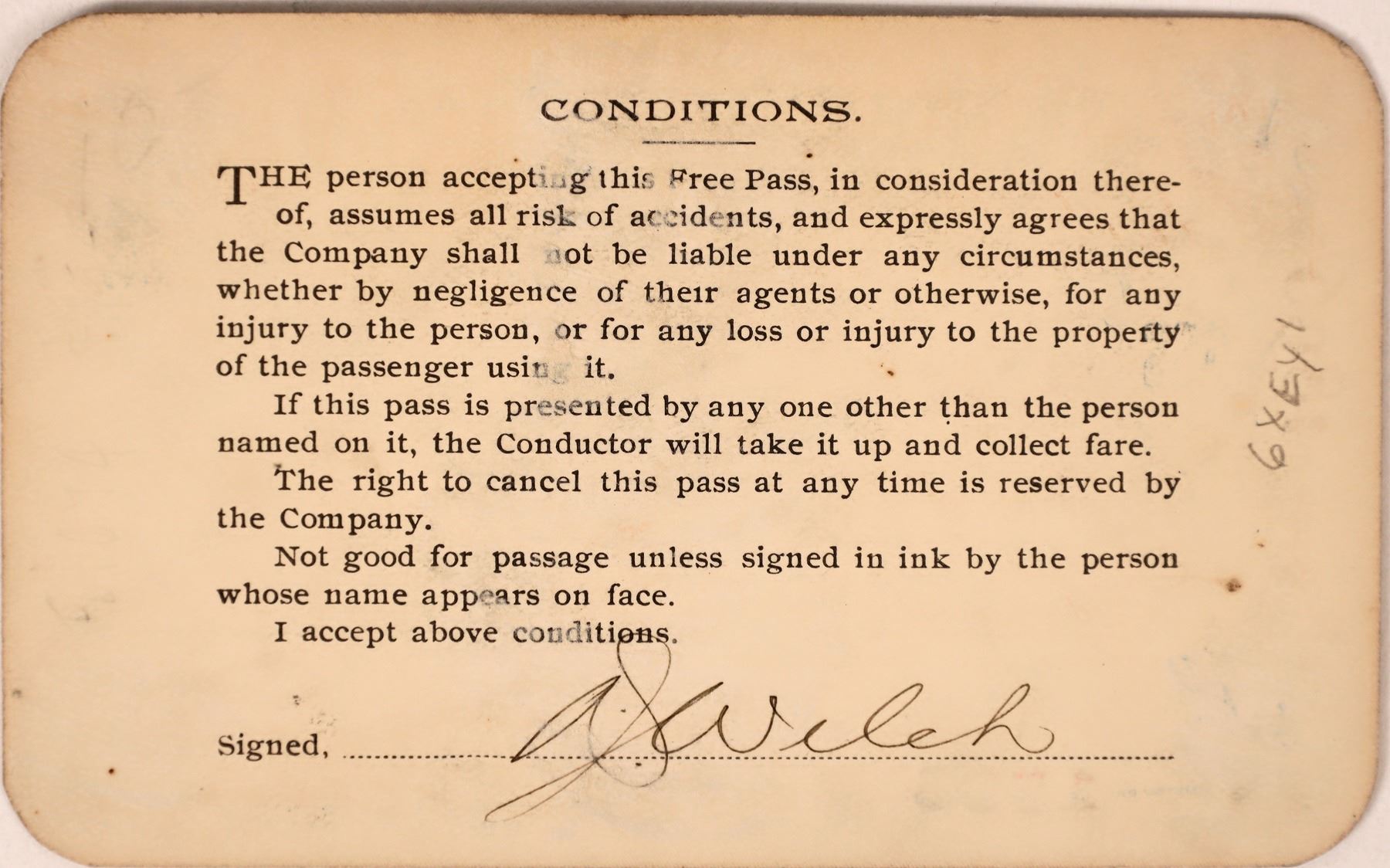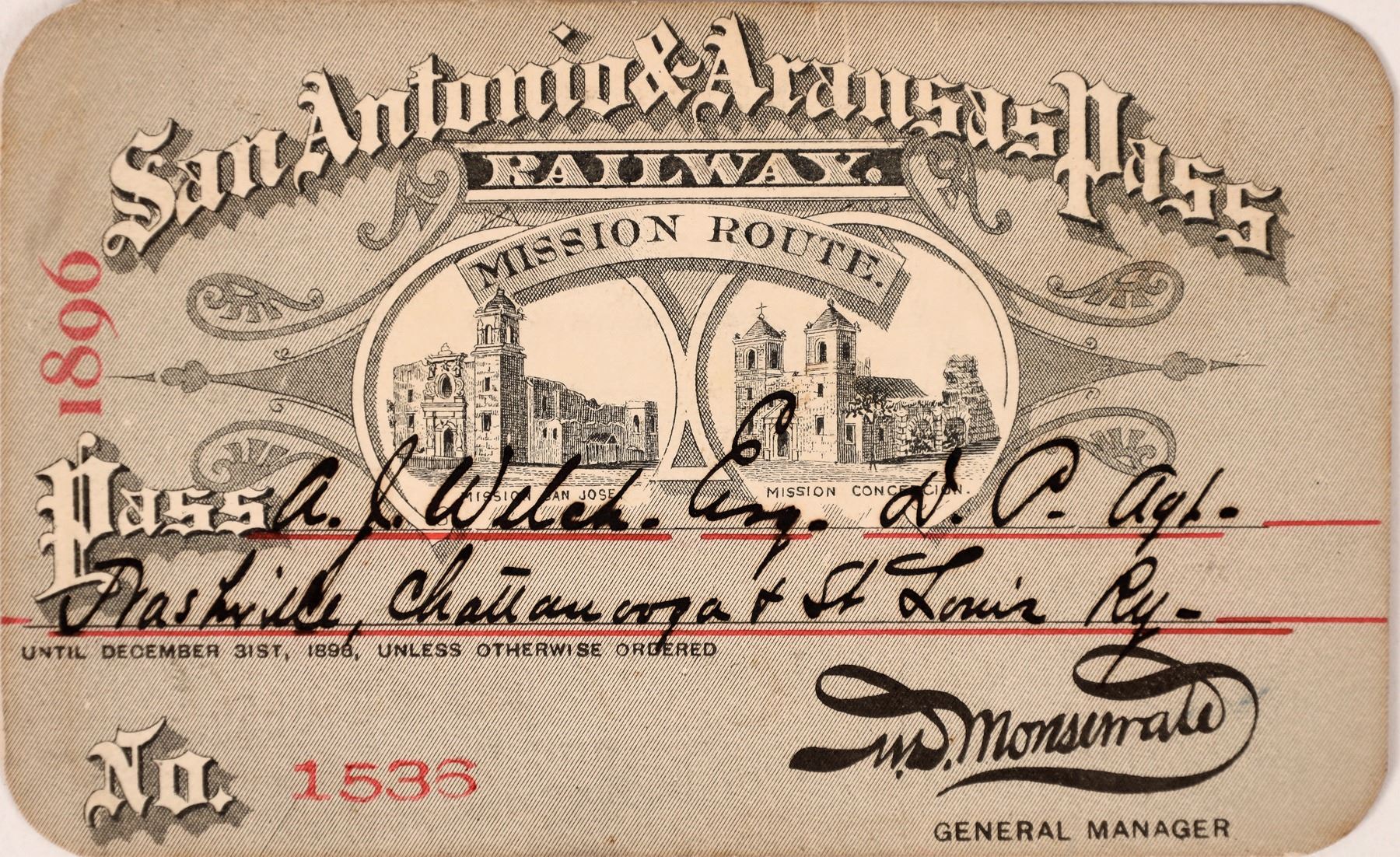 "Mission Route." Nice pictorial pass featuring vignettes of two missions (San Jose and Concepcion). No. 1536, issued for 1896 to A.J. Welch, (Nashville, Chattanooga and St. Louis Railway). Printed signature of the general manager. Endorsed by Welch. Printed on gray cardstock with ornate logo. Toning, especially around the edges. The San Antonio and Aransas Pass Railway began operation in Texas in 1886. Uriah Lott and businessmen of San Antonio built it as a direct route from the city to Aransas Bay on the Texas Gulf coast. Absorbed by Southern Pacific.