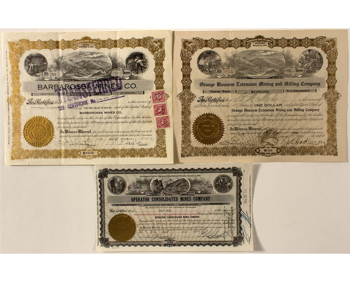 Lot of 3: 1 is Operator Consolidated Mines Co. from 1936. 2 is the Barbarossa Mines Co. from Kern Co. 1931, with 3 10c revenue stamps on the front, from 1910 in the Kalinote district. 3 is the Orange Blossom Extension Mining & Milling Co. from 1910, in the Bagdad district of San Bernardino. All have excellent vignettes, and are in very good to excellent condition.