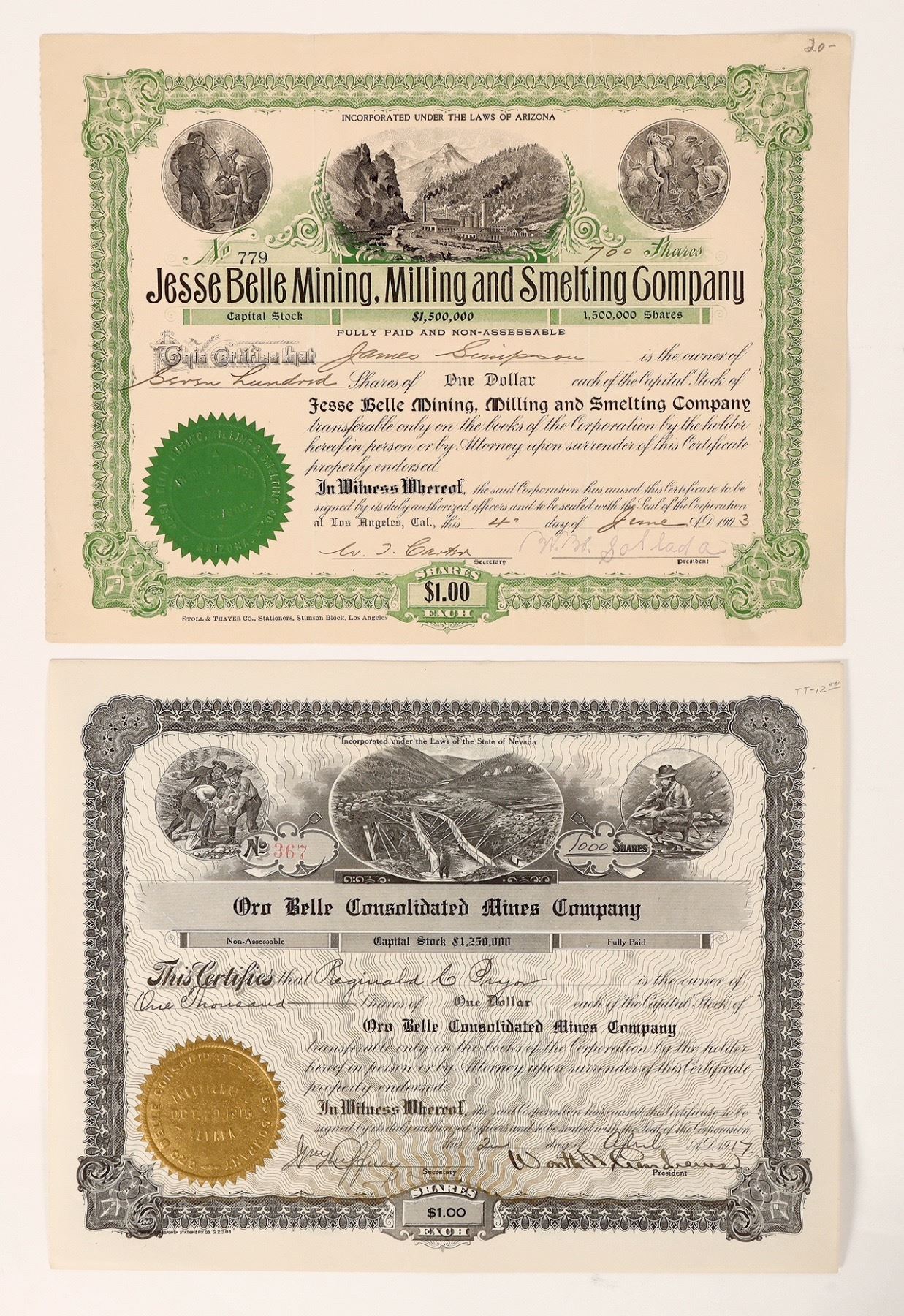 Issued-1917 Oro Belle Cons. Mines-located in Hart. 1903 Jesse Mining, Milling and Smelting.[ San Bernardino county California