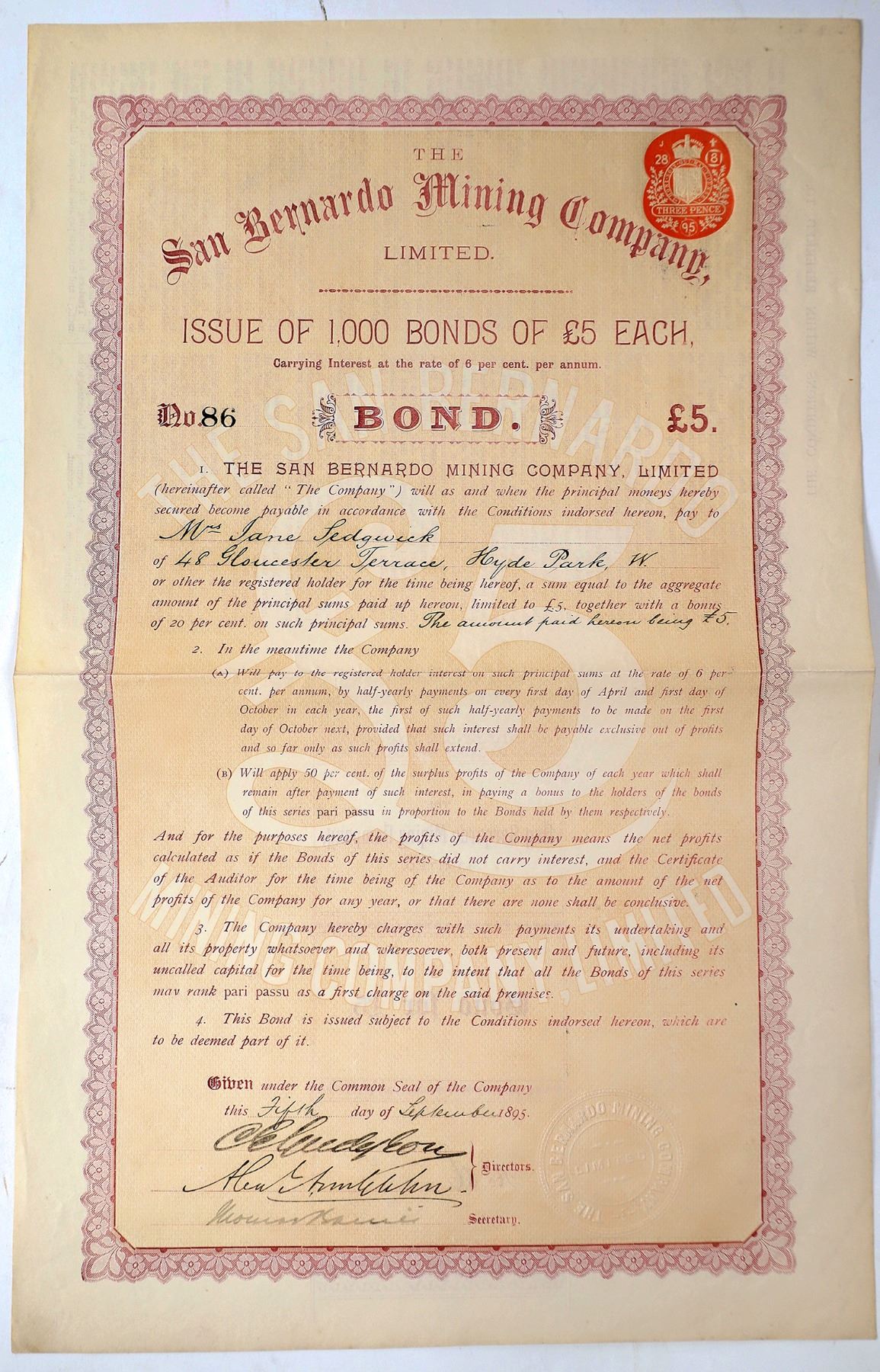Rare bond. Sonora Mexico silver mine, issued in England, 1895.