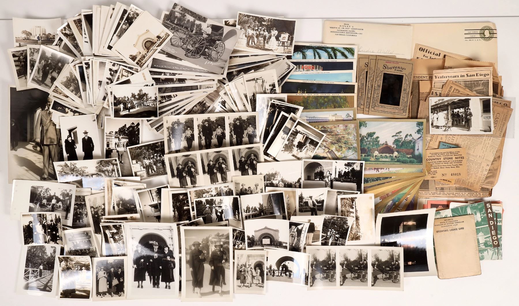 Nice collection of photographs from 1936 San Diego Expo. About 30 postcards, roughly half are RPC's. Assorted newspaper clippings. About 250 photos, roughly 2.5x3.5".