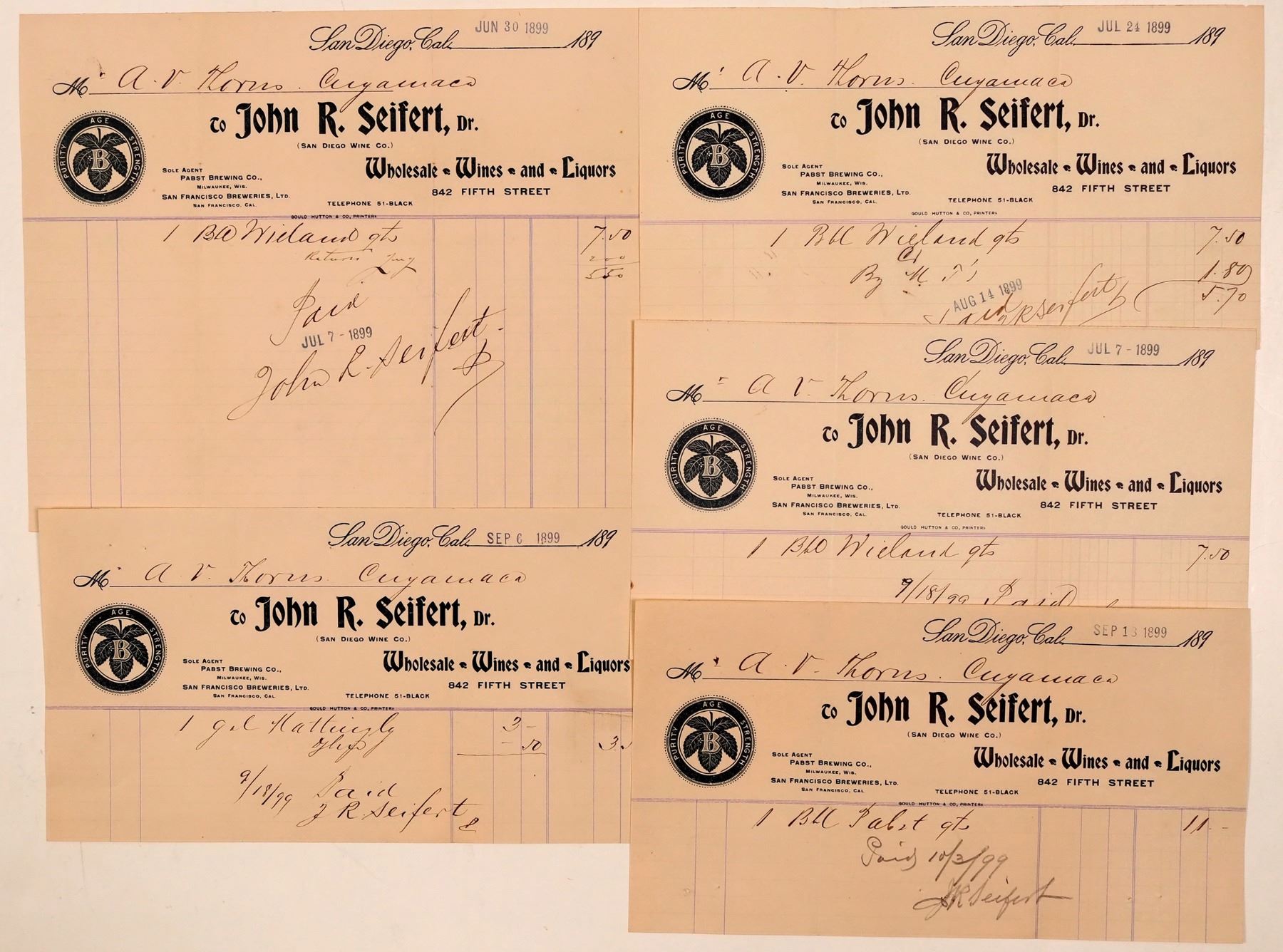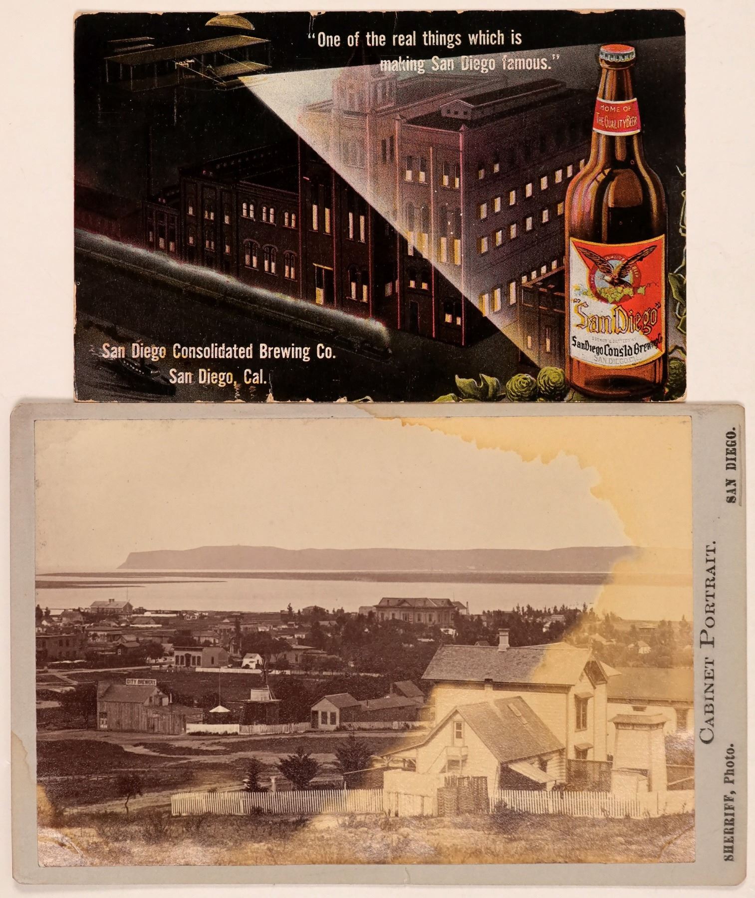 Lot of 2. 1) Post card from the San Diego Consolidated Brewing Co. The caption reads "one of the real things which is making San Diego famous."Dated May 1911. Mailed to a brewery in Hartford, Connecticut. 2) Photograph overlooking the City Brewery building in San Diego in 1883. The photographer is identified as J.A. Sheriff located on the corner of Fifth and E streets. Measures 5.75" x 3.95" and 6.5" x 4.20" on the matte. The focus is sharp and the contrast is medium. There is wear on the right side.