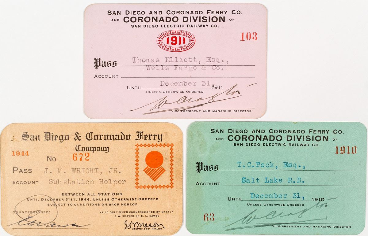 Lot of three different. Also good for Coronado Division of the San Diego Electric Railway Company. Includes: 1910, 1911, and 1944. All printed on different color cardstock. Moderate wear. Please inspect photos. (Prag Collection) City: San Diego State: California, Date: Inventory# 39173