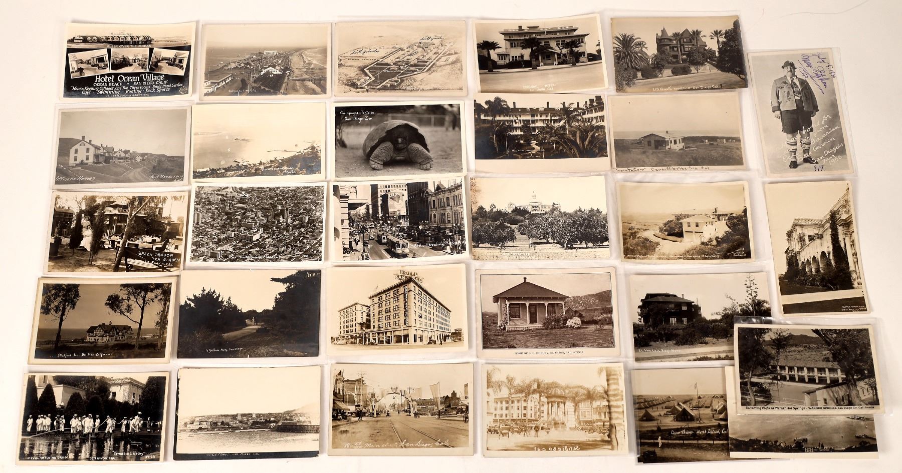 Lot od 25. Mix of wht. border and borderless. Postmarks : La Jolla, San Diego, Santa Barbara, Coronado. Street level view : Stanford Inn Del Mar, Officers Homes Fort Rosecrans, Main ST San Diego (1900 era),Camp Thomas North Island, Theosophical Institute Point Loma, U.S. Grants residence, Colonial Hotel. Birds eye view: Fifth and Broadway , U.S. Navel Training Center (gone now), downtown San Diego, Fort Rosecrans, Coronado Tent City. San Diego California 1900 -30 Ken Prag Collection