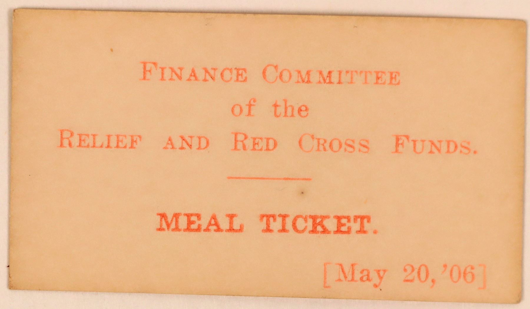 White cardboard token: Finance Committee / of the / Relief and Red Cross Funds / Meal Ticket / May 20 , '06.