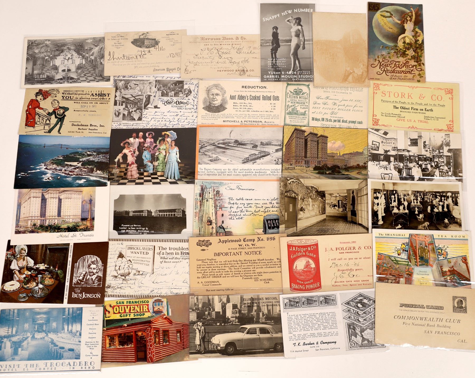Lot of 31. Some of the bests are RPC of Eastman's Italian Marble Art Studio, RPC BURNHAM Plumbing, RPC Solari's, Aunt Abbey's Cooked Rolled Oats, American Biscuit Company, Crown Flouring Mills, Heywood Brothers, Finocchio's with fancy girls, Haynes automobile Manufacturing. Also, Coppa, bricklayers wanted, Stork & Co., Folger, Applewood Workman of the World, Memorial Tower, Gabriel Moulin Studios, RPC of Delman, Deckelman barbers, etc. And still more. TWO 'No Split Reverse': Hotel Fairmont and Café Odean 1906. Perhaps the most colorful card is a Hotel St. Francis!!!