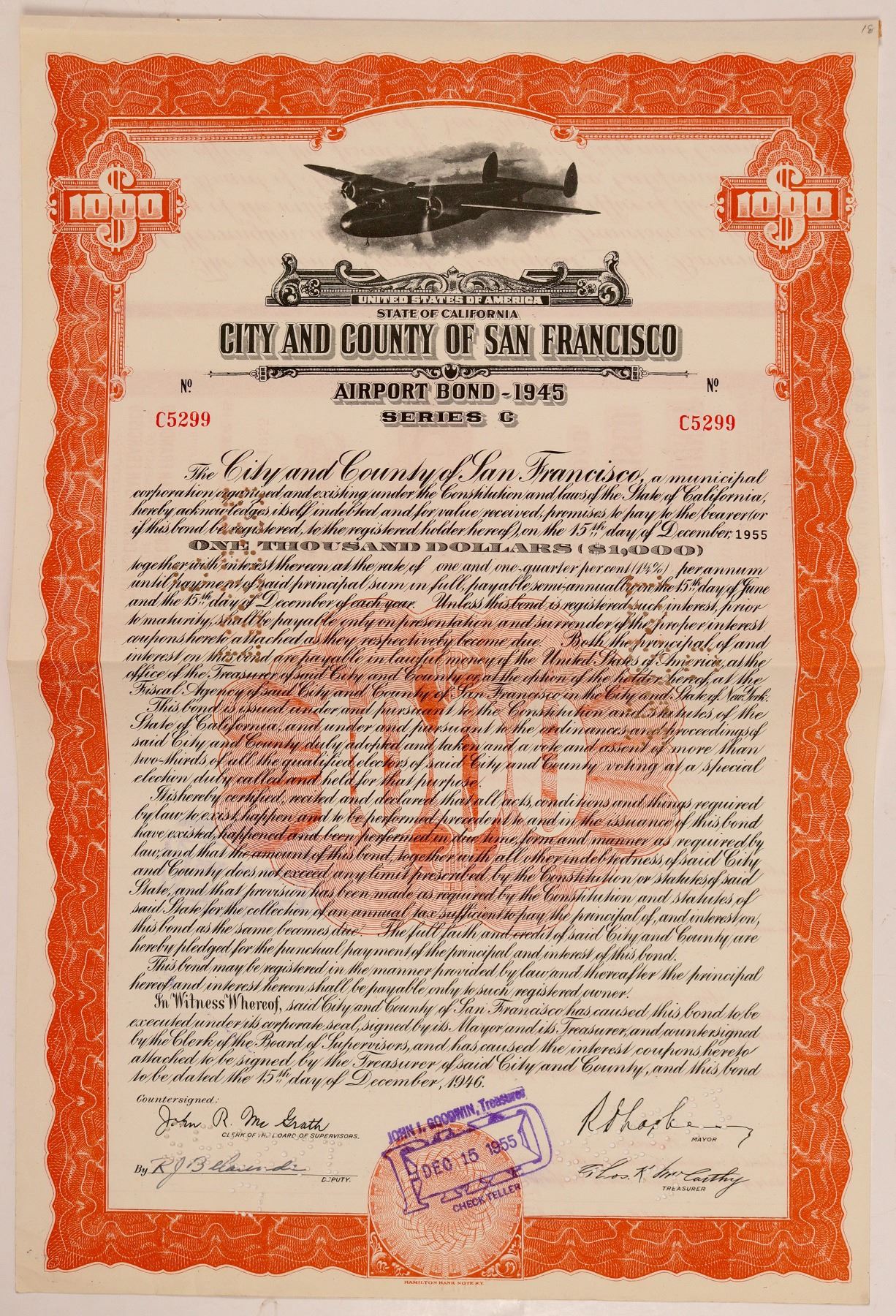 City and County of San Francisco Airport Bond, 1945 Series C. $1,000. Issued Dec. 15th, 1946. Punch cancelled. Printed signatures of the mayor, treasurer, deputy and clerk of the board of supervisors. Orange border, black print, and a photo vignette of an airplane. Printed by Hamilton Bank Note. 15 x 9.75" Ken Prag Collection
