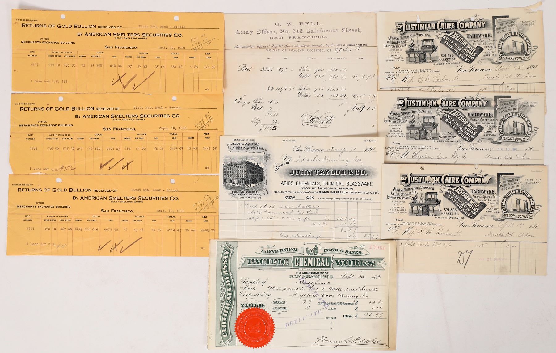9 pieces of c. 1898-1920 assay and assay equipment ephemera. 3x American Smelters, Returns of Gold Bullion. Pacific Chemical Works gold assay receipt. G W Bell silver and gold assay receipt. Billheads-John Taylor, 3x Justinian Claire. San Francisco California