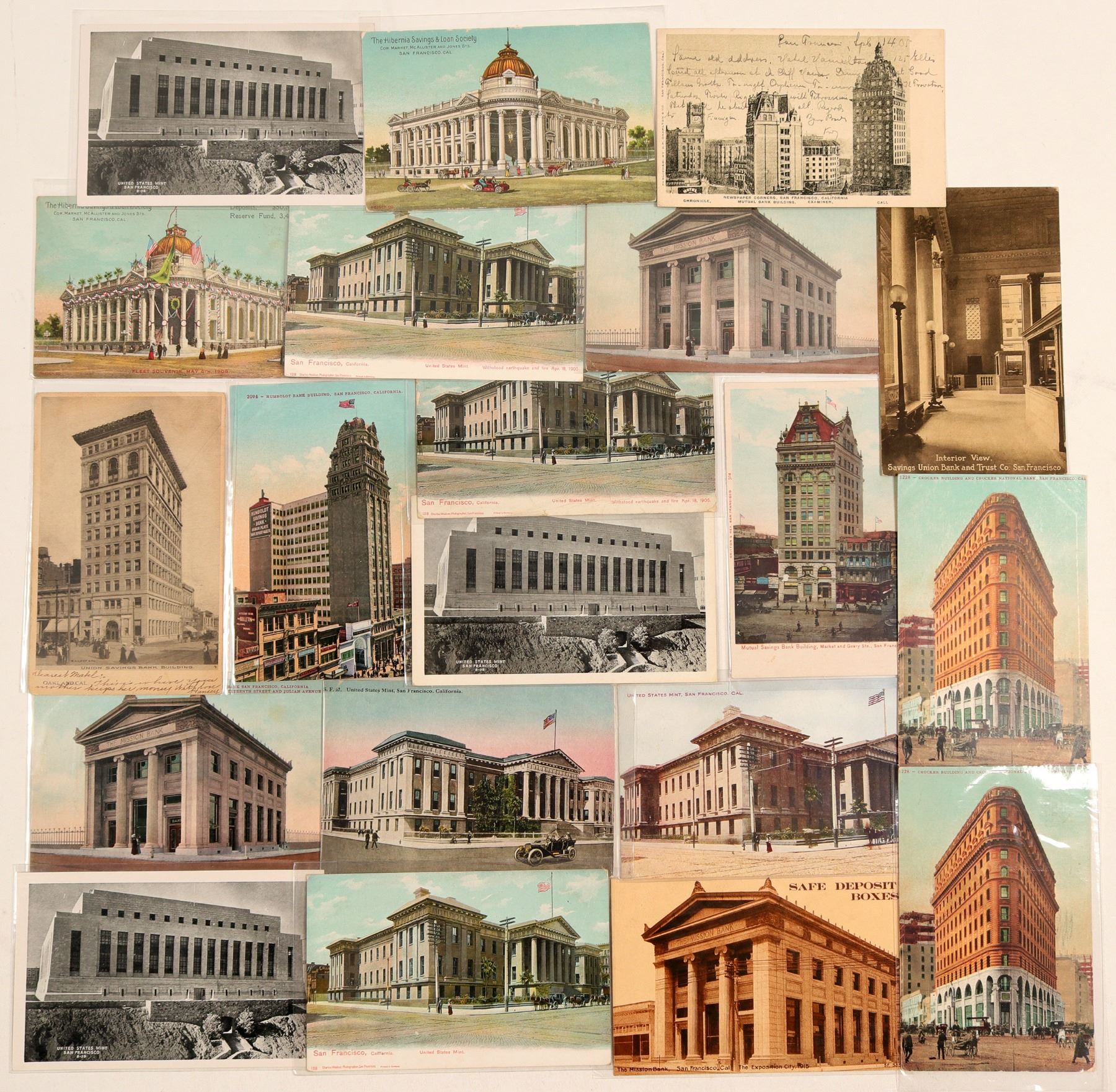 20 Chromolitho's: The Mission Bank, The Exposition City,1915; Crocker Building & Crocker National Bank; The Hibernia Savings & Loan Society; Mutual Savings Bank Building, Market and Geary Streets; U.S. Mint. Salvatore Falcone Collection