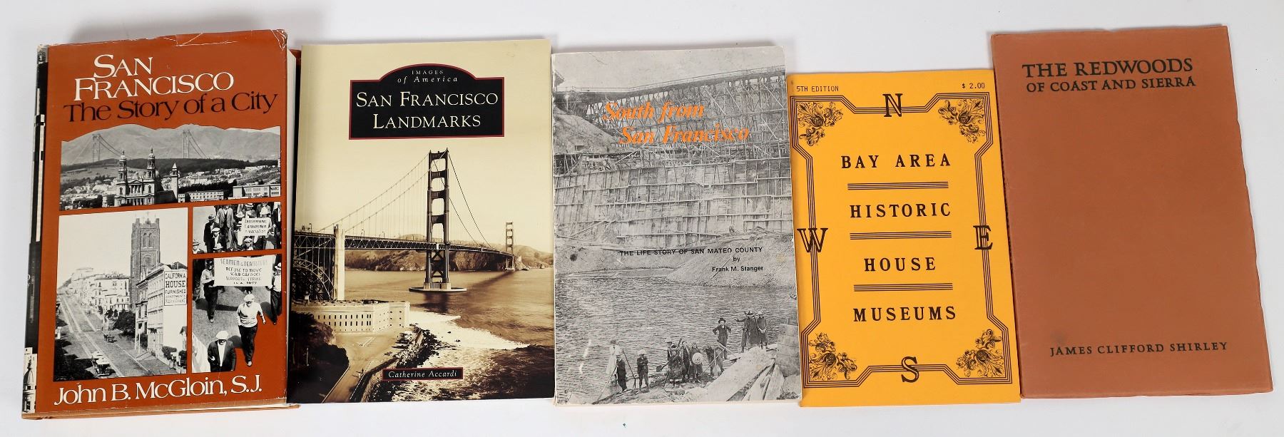 1) "South From San Francisco", The Life Story of San Mateo County, it's History & Heritage, by Frank M. Stanger, Publ. by San Mateo Co. Historical Society, 1963 ~ (6"x 9"SC, 214 pages) 2) "The Redwoods of Coast & Sierra", by James C. Shirley, publ. by University of California, Berkeley, 1937 ~ Covers everything you want to know about the Redwoods ~ 24 photographic plates, 4 text figures ~ (6"x 9 1/2"SC, 84 pages) 3) "San Francisco Landmarks", By Catherine Accardi, Images of America Series, published by Arcadia ~ Vintage photographs and captions describe S.F.'s evolution into one of America's most historic and captivating cities ~ (6 1/2"x 9 º"SC, 127 pages) 4) "San Francisco", the Story of a City, by John B. McGloin, S.J., Published by Presidio Press, 1978 ~ Told in four (4) parts or era's (6 ì x 9"HB, 445 pages) 5) "Bay Area Historic House Museums", 5th edition, 1989 ~ Provides maps, location, hours & phone #'s for 24 unique homes and mansions on both sides of the Bay ~ (5 1/2"x 8 1/2"30 pg. bkt.