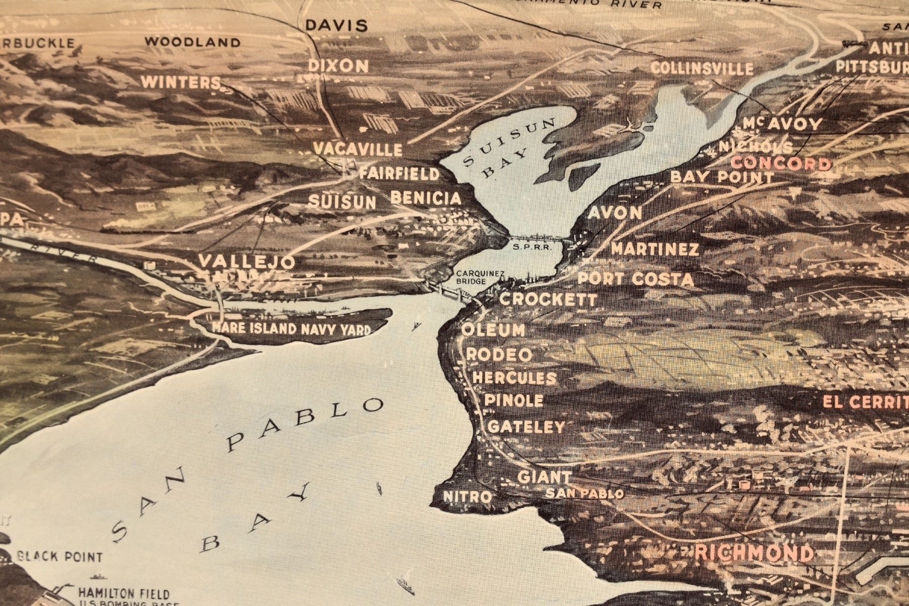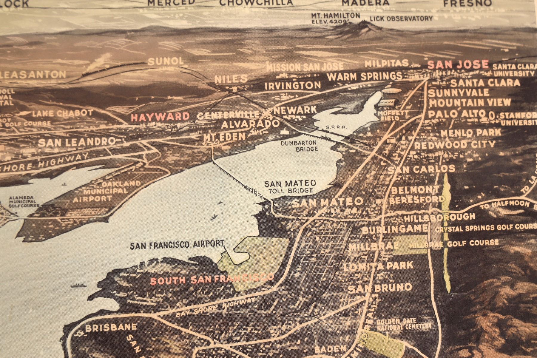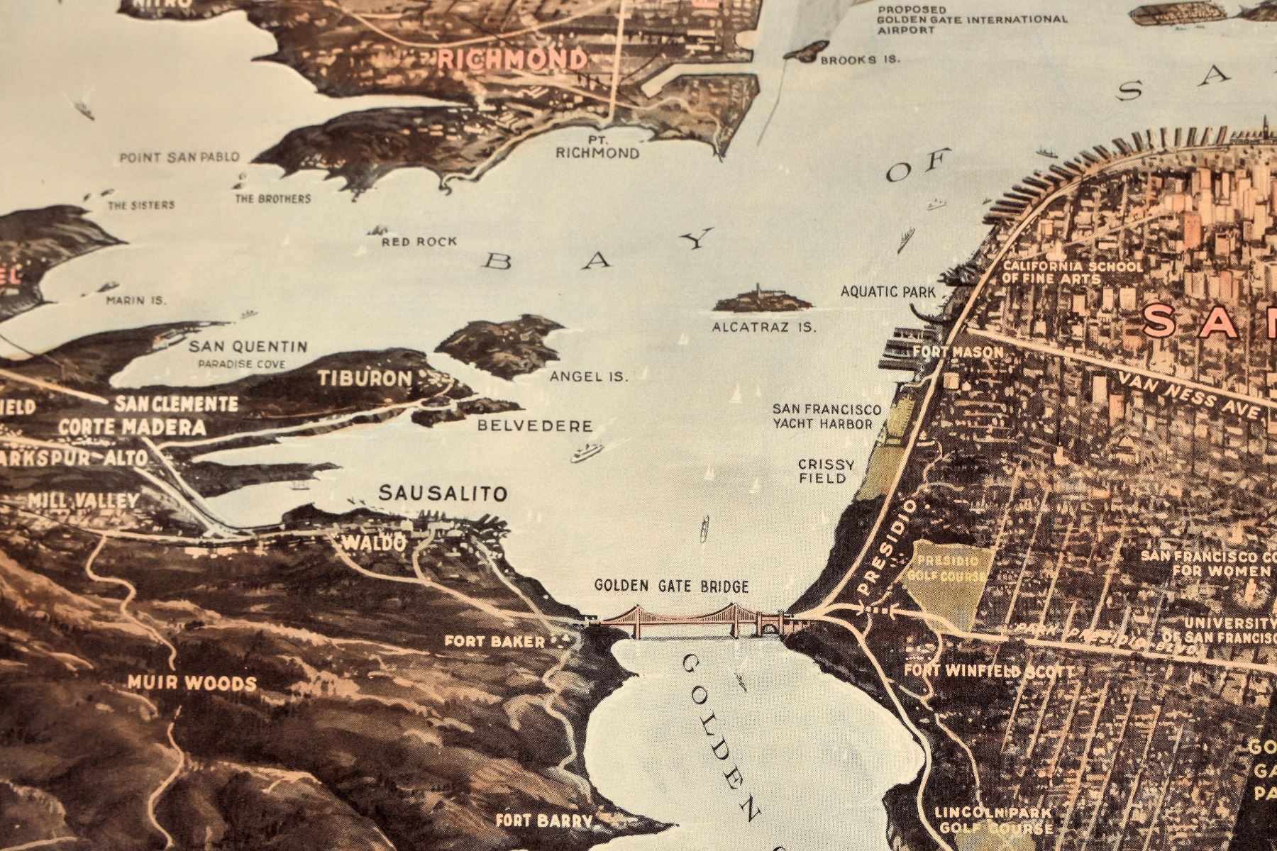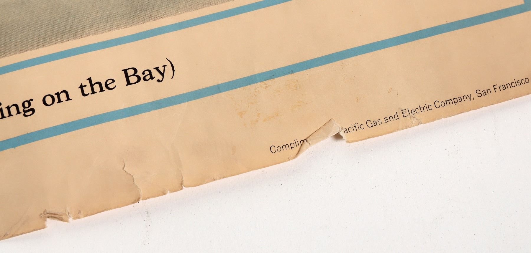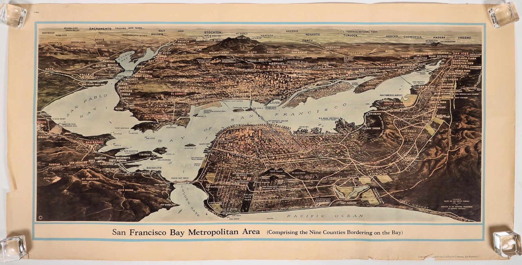Rare. San Francisco Bay Metropolitan Area map printed by Pacific Gas & Electric in 1944. Color. Even shows the site for the proposed Golden Gate International Airport! Toning, creases and rips along the edges. 17 x 33.5" Would like very nice matted and framed. Please inspect.