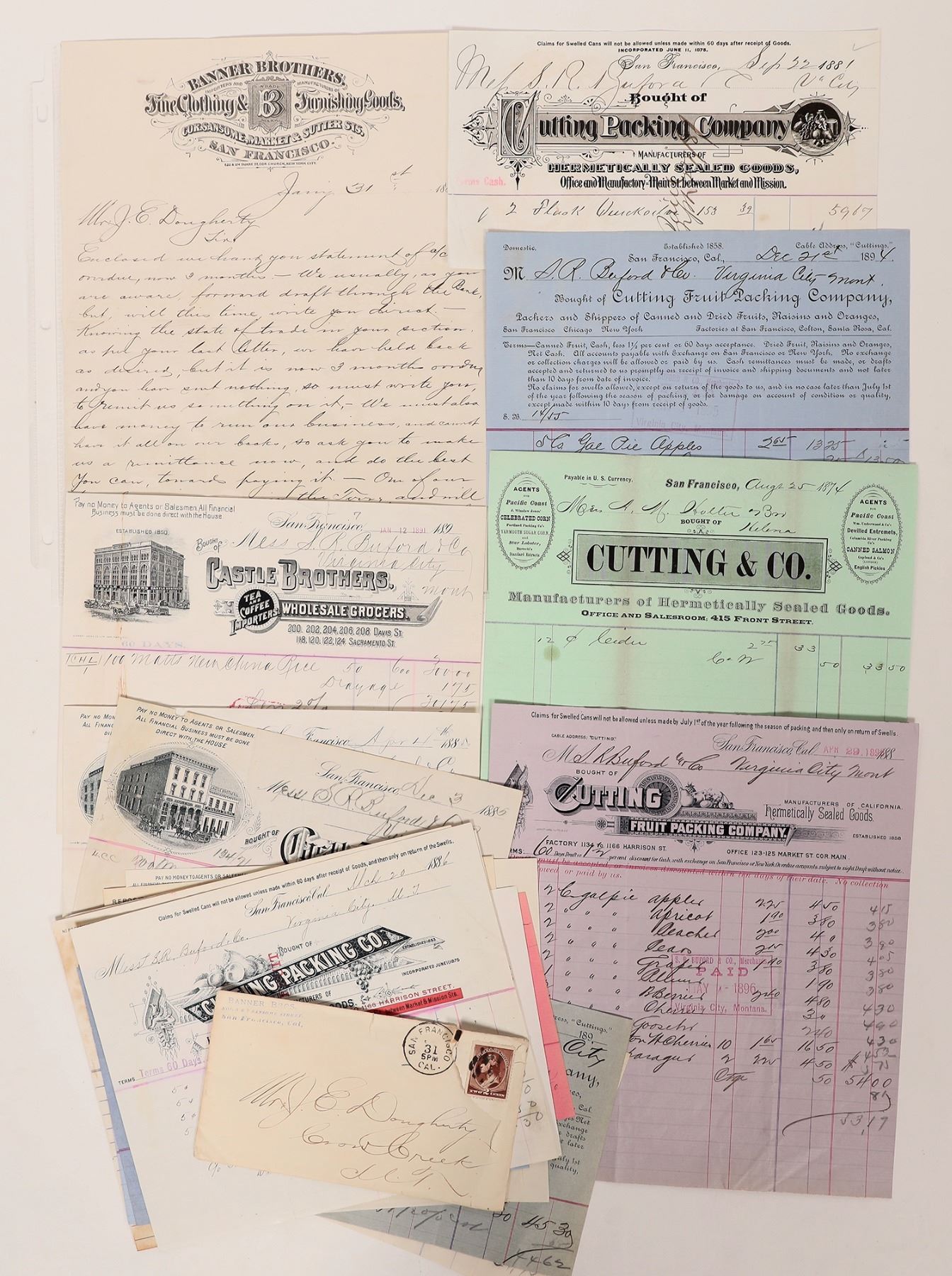 Nice collection of Cutting Fruit Packing Company and other San Francisco business billheads from the 1800s. Over 20 billheads including Castle Brothers wholesale grocery; Banner Brothers; and Cutting Fruit Packing was the company that made the first embossed California bottles, but the factory burned down in the 1850s. San Francisco California