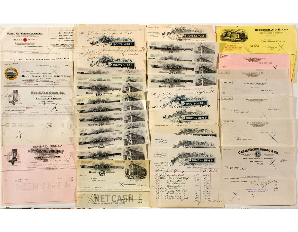 Lot of 33 billheads/invoices. Includes: Williams-Marvin Co. (1897-1922), two different style illustrated billheads, 23 total; Cahn, Nickelsburg & Co. (1916-1923), six invoices; Wm. V. Tascher (1916); Evans Shoe Co. (1916) pictorial; Buckingham & Hecht (1916) pictorial; and Nap-A-Tan Shoe Co. (1922) pictorial. General wear (rips and folds). Please inspect. All issued to J.C. or C.E. Young in Taylorville, CA (a prominent merchant).
