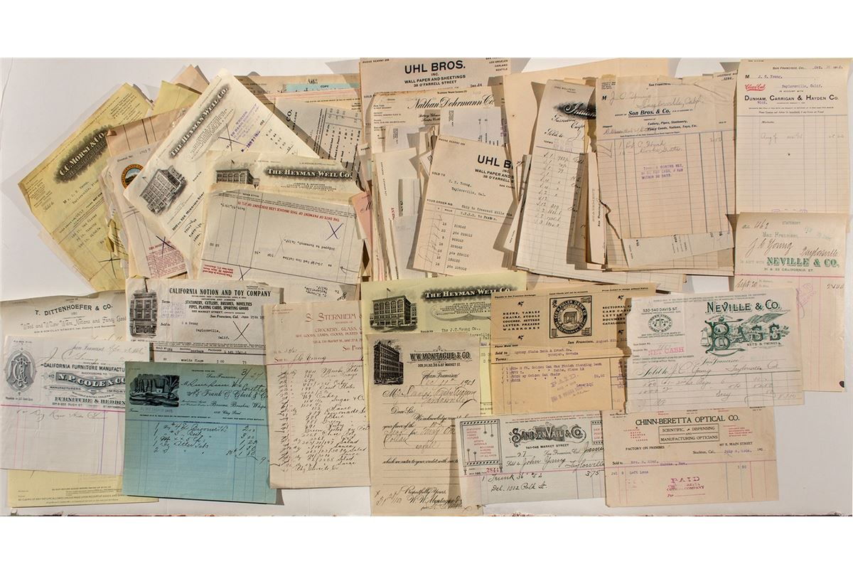 200+ billheads and receipts for Dry Goods dealers in San Francisco and Oakland. Most date to the turn of the century to 1920, though there are some pre-1900. Includes: Uhl Bros., Neville & Co., Chinn-Beretta Optical Co., C.C. Morse & Co., W. & J. Sloane, E.J. Bowen, Milwaukee Furniture Co., and others. General condition is good, though many have folds, toning and rips. Please inspect! Dealer's lot!