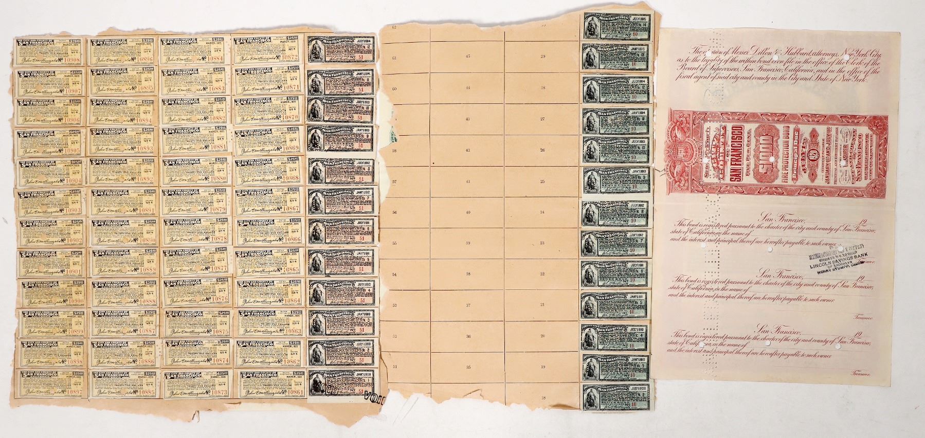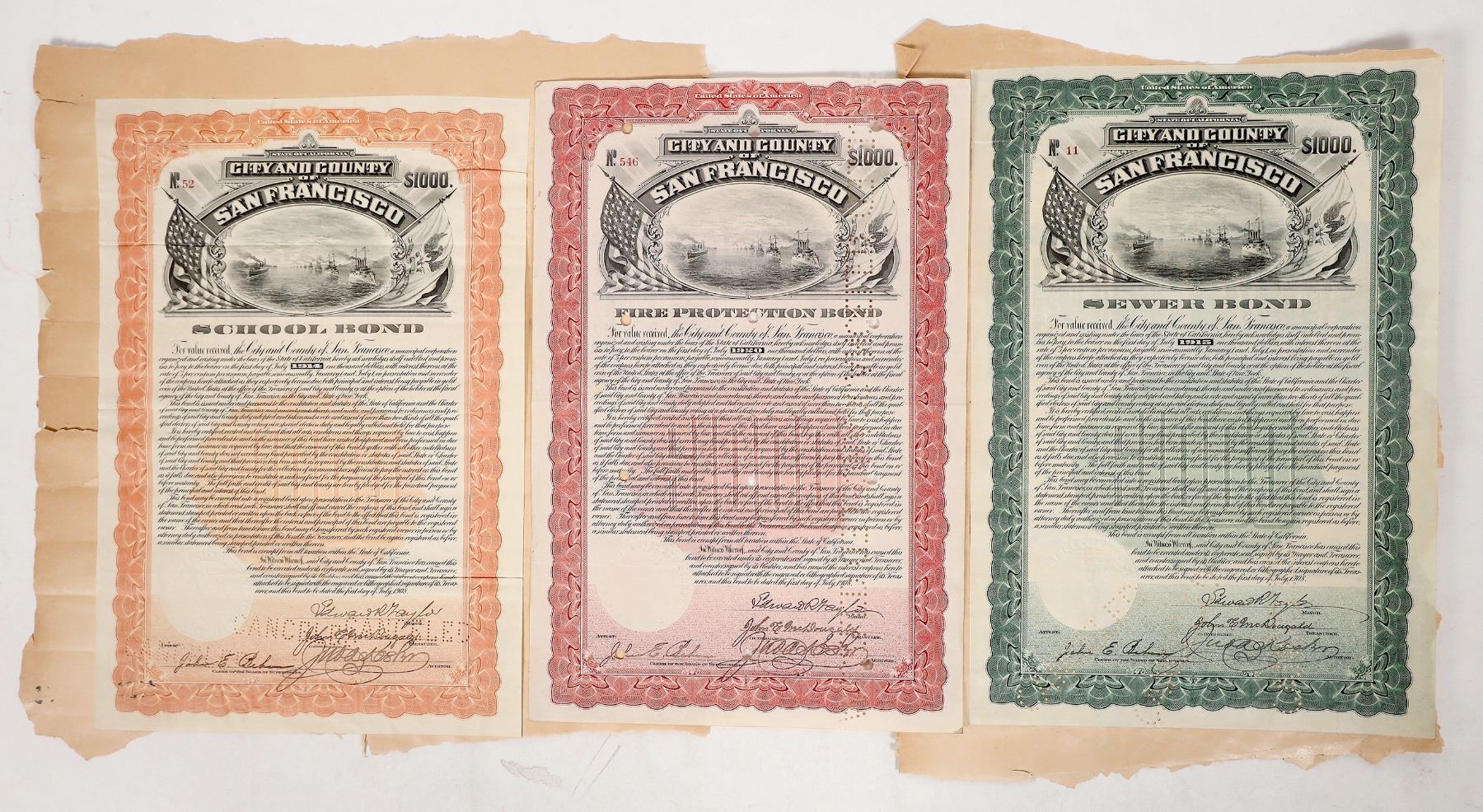 Group of 3 $1000 bonds issued by the City and County of San Francisco: a school bond, a sewer bond, and a fire protection bond. All three are dated 1908, and are both issued and cancelled. All signed by SF mayor Edward R. Taylor. Nice vignette of ships in harbor and embossed city seal on each. The sewer and school certificates are mounted on paper with bond coupons attached on verso. Generally good condition; some warping on the mounted certs.