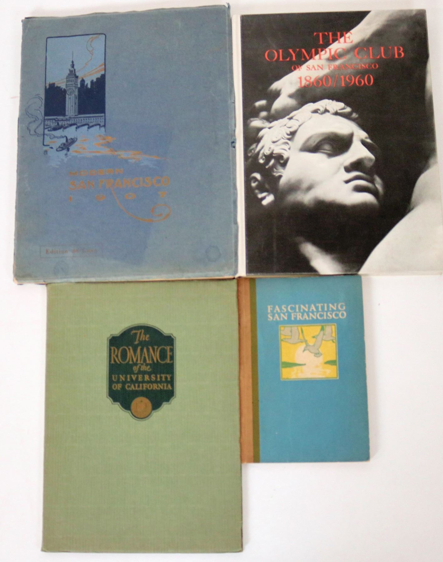 2. The Romance of the University of Calif. University Alumni Assoc. 1928. Filled w/information and mission statement of the University and lots of b/w photos. 3. The Olympic Club of S.F. 1860-1960, Hardbound Centennial. Photos and information on all aspects of the club including it’s history. 4. Modern San Francisco, 1907. Soft bound. B/W photos of the era. Stories of the different areas of the city, architecture.