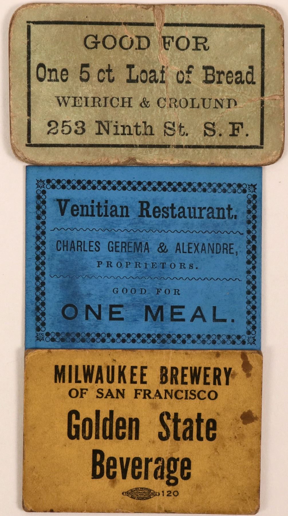 Lot of three: Milwaukee Brewery of San Francisco, GF 5c; Venitian Restaurant, GF One Meal; Weirich & Crolund, GF one 5 ct Loaf of Bread. Ex: Ron Lerch Collection.