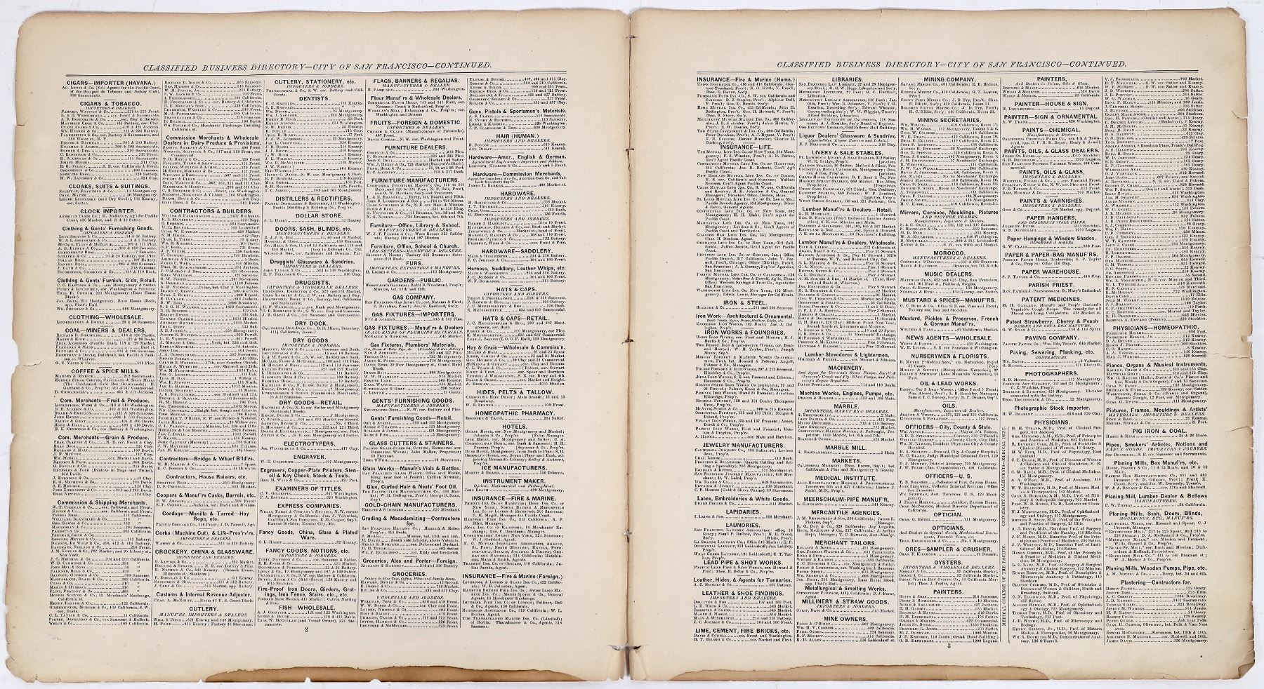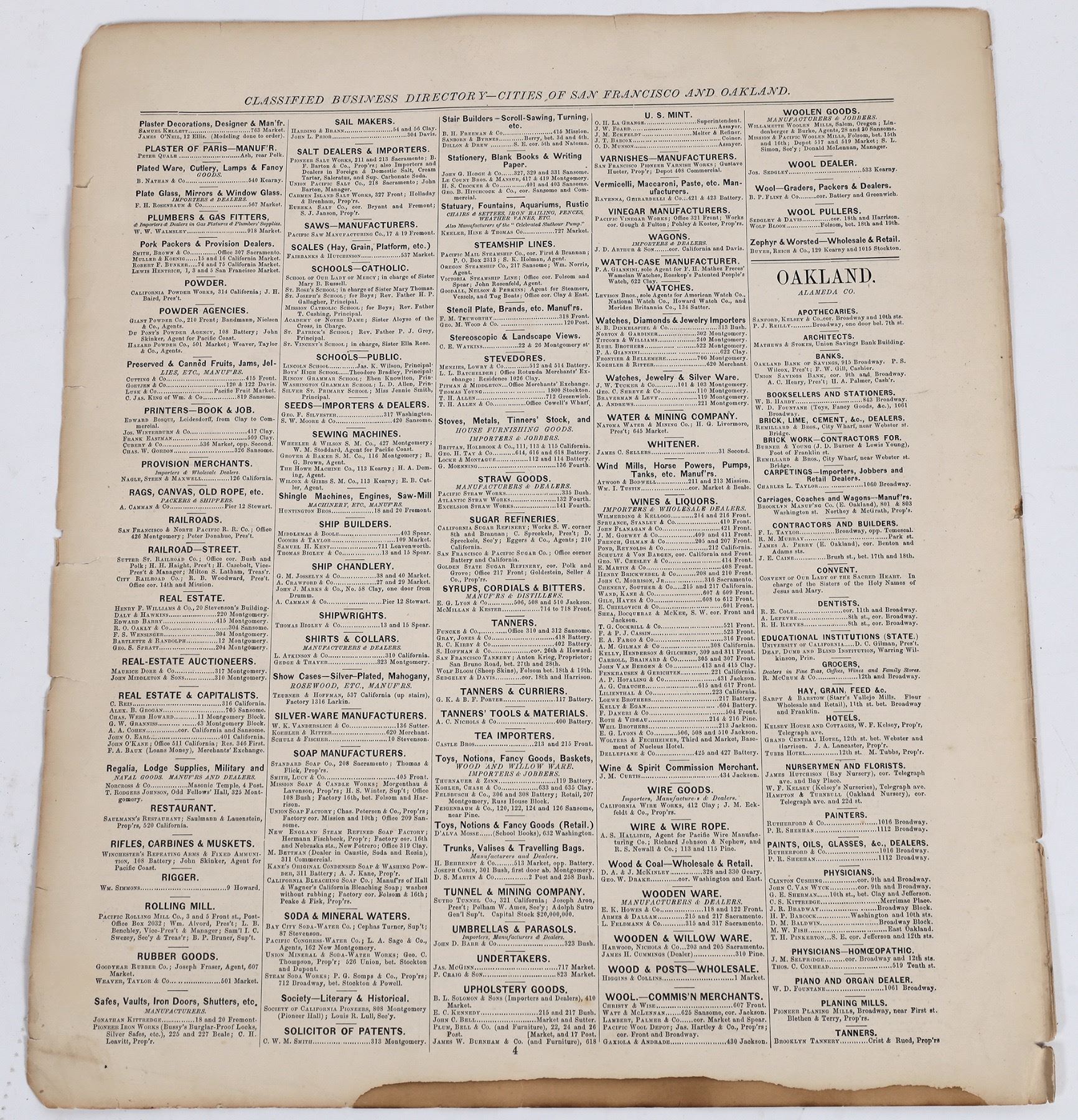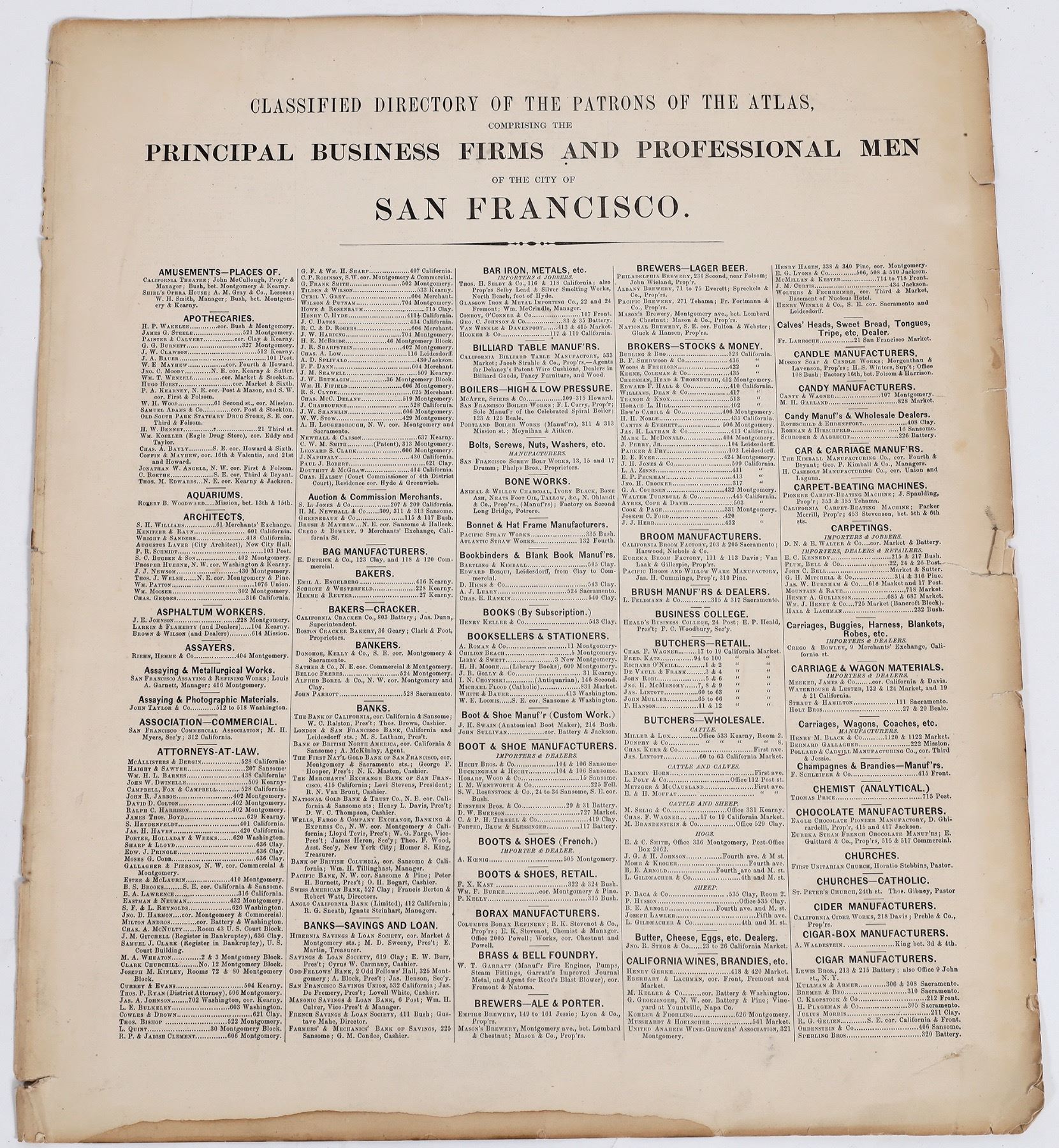 Classified Directory of the Patrons of the Atlas comprising the Principal Business Firms and Professional Men of the City of San Francisco. Two loose pages that were originally part of a book. Classified list of businesses alphabetically arranged. 17.25 x 14.75 inches. Tears along the edges.