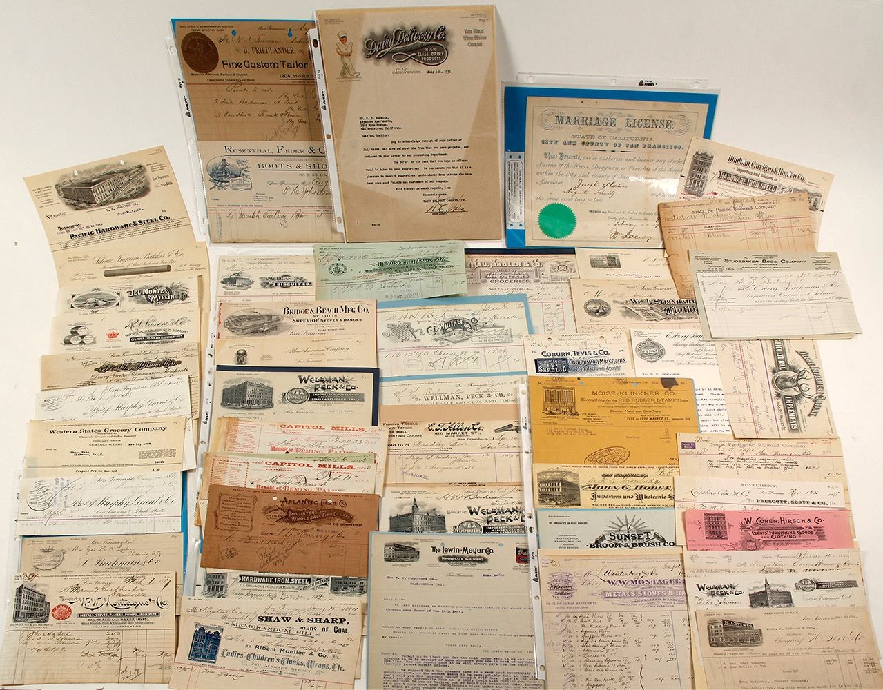 San Francisco, CA Billheads and Letterheads assortment, approx 60 different including many pictorials. Items include cigars, pipe, groceries, brooms, cloaks, stoves and more. (Potter Collection) HWAC# 59702 Date: c. 1870's-1922 Location: San Francisco, California