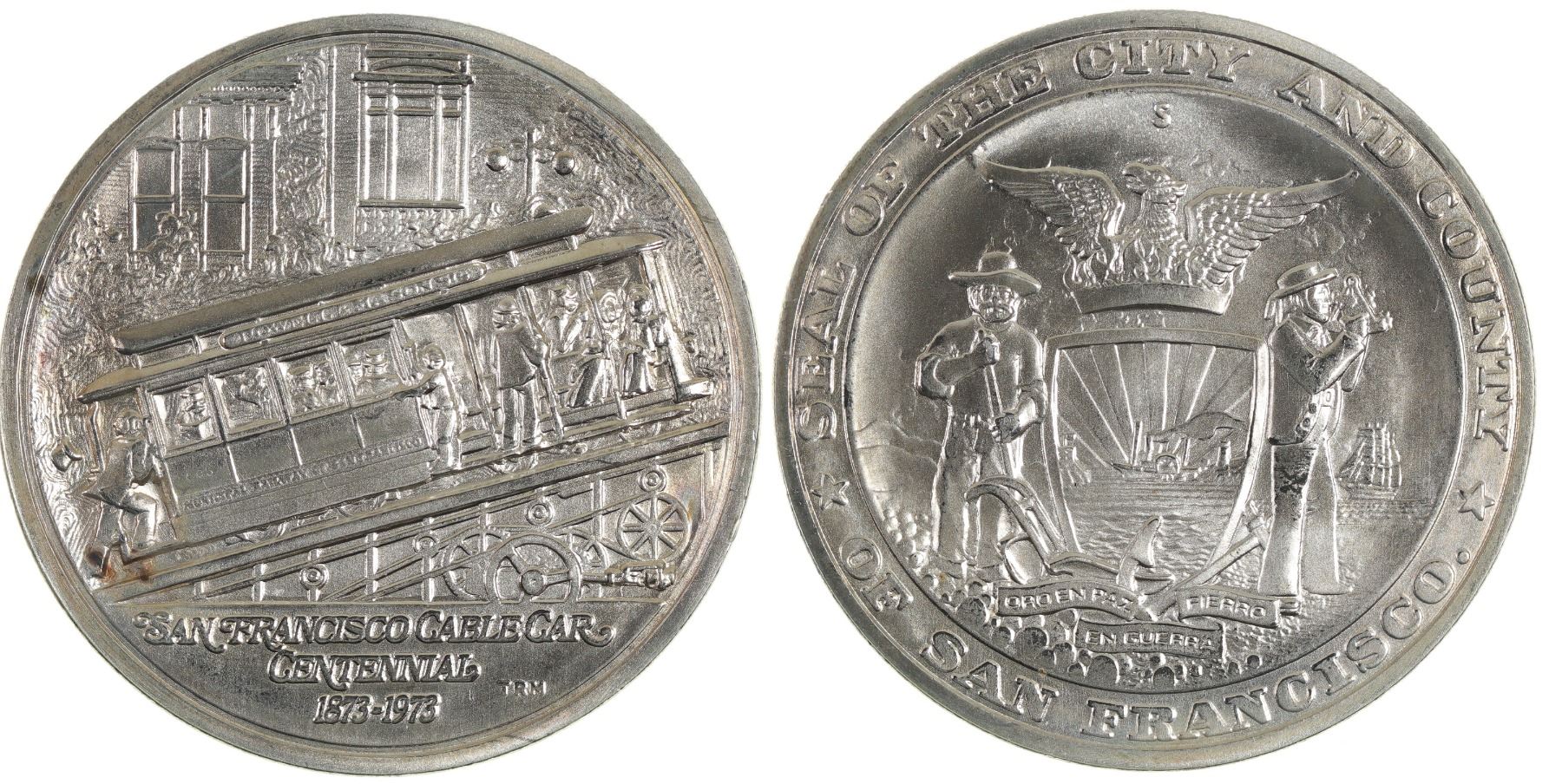 Rare "S" mint San Francisco Cable Car Centennial silver medal issued 1973. They made one in gold (the first medal struck in gold since 1930), and a larger version was made at the Philadelphia mint in silver and bronze. California San Francisco 1973