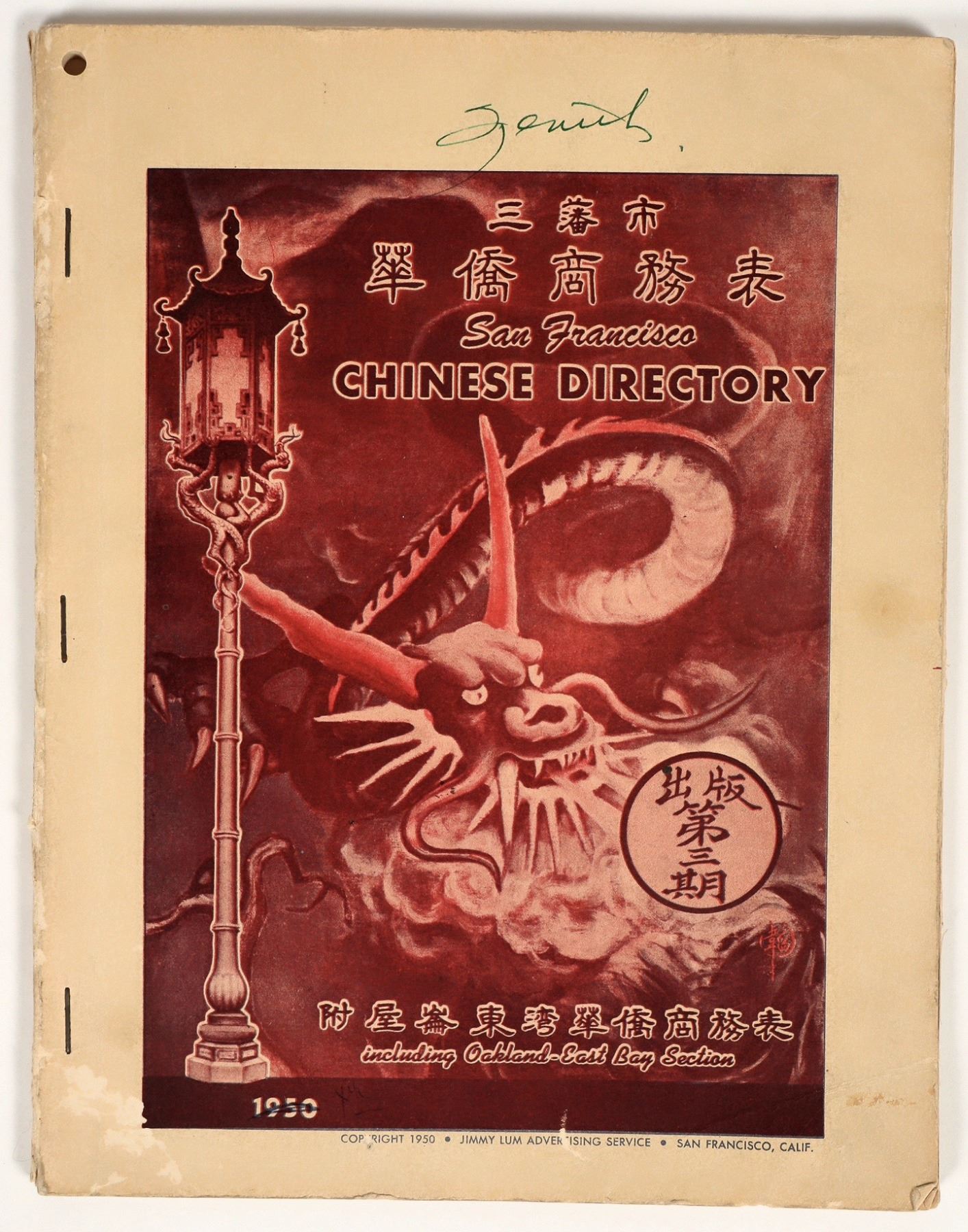 107 pp. softbound. Fascinating look at Chinese history in San Francisco in 1950. All of the addresses are in English and also Chinese characters. Broken down by street name listing all on Grant Ave. or Clay Street for example. There is a great street map of Chinatown with Chinese characters on pages 24 and 25. Many advertisements for all sorts of Chinese businesses. On page 69, there is an advertisement from the Cathay Chapel, offering a Fine Funeral as low as $90.00. Greenlawn Memorial Park was offering a "Modern Dignified Service" under a picture of the cemetery with all the headstones. Many ads for food, jewelers and any other business you can think of. This is a very rare and desirable piece. Very good condition. Three large staples. A tight copy.