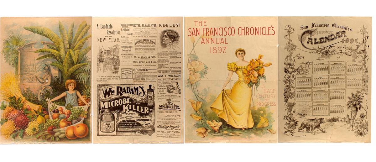 San Francisco Chronicle Annual Calendar “A Half Century of Progress.” Calendar and black and white lithographs by “Langguth” on obverse. The reverse has lithograph of lightly shaded monotone colors and red title reading “The San Francisco Chronicles Annual 1897” Second, a cherub lithograph in exuberant colors with a reverse of large advertisements. The most pronounced ad is for “William Radam’s Microbe Killer” endorsed as the “greatest remedy of the age, cures disease by removing the cause… microbes.” Likewise, there are ads for various hotels, services, utilities and goods. Some include small vignettes of the product. Both pages measure 23” x 17” and have an obverse and reverse. All colors used in the lithographs are in blissful condition and bear delicate texture and shading. Print and fonts are in equally superb condition. Minor separations along crease lines and small tears on bottom edge of both: does not obstruct the images or advertisements. Good. Burger CollectionCity: San FranciscoCounty: San FranciscoState: CADate: