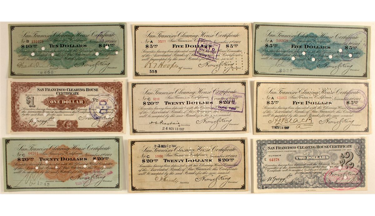 Lot of 9: one $1; one $2; three $5, one $10; three $20. The Panic of 1907 caused a scarcity of coinage in the West where paper money still did not circulate. Bank holidays and the issuance of clearing house certificates eased the pressure on banks. These notes circulated through out the west coast, Hawaii and as far east as Philadelphia.