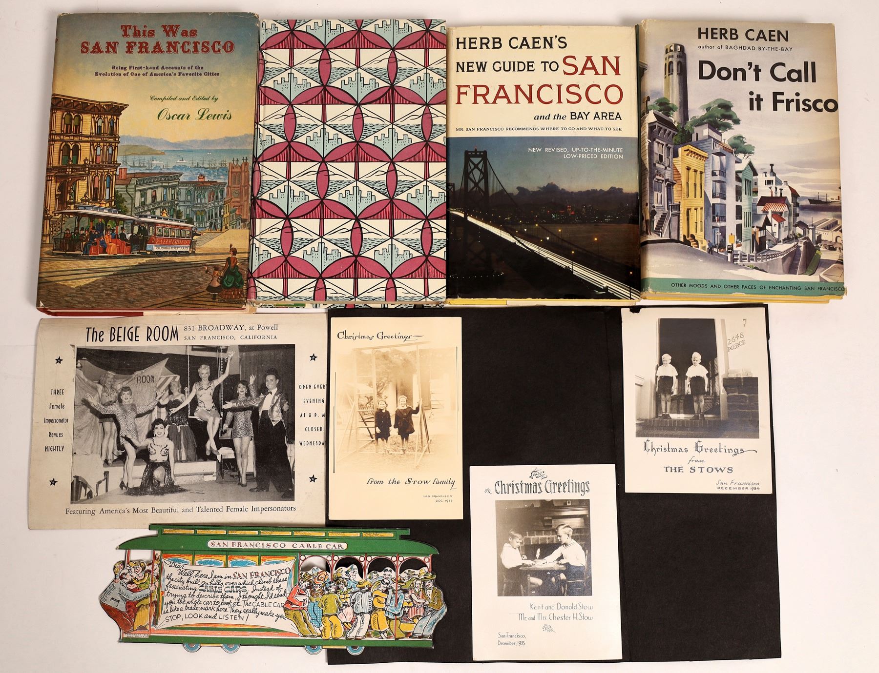 1) San Francisco Cable Car postcard.(see photo) 2) The Beige Room Postcards. 6.25 x 9. Has photo in center of "Talented Female Impersonators". 3) 5 Greeting cards glued to black paper from The Stow Family, San Francisco. 1933-1937. 4) San Francisco Is Your Home by Samuel Dickson. Stanford University Press; Stanford, California. 1947. 262 pages. 5) Don't Call it Frisco. by Herb Caen. 1953. Herb Caen's New Guide to San Francisco and the Bay Area. 1957. 7) This Was San Francisco by Oscar Lewis. 1962.