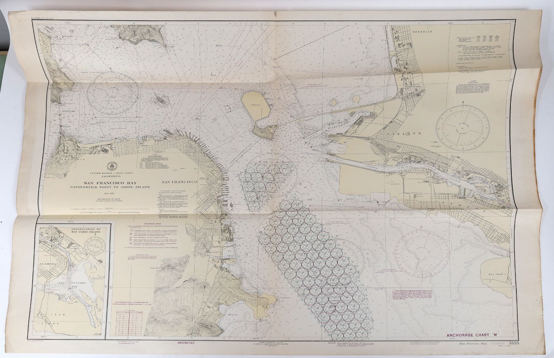 City & County of San Francisco, by H. A. Candrian, 1932 Two color map, 27 O"W x 22 O"H ~ Backside is 17" x 13"map of San Mateo & Burlingame, and a 13 O" x 4 O" illustration of S. F's waterfront and beyond 2) San Francisco, the Exposition City, by No. American Press Assn., 1912 ~ Reproduced in 1968 by First Savings & Loan ~ Multi color lithograph, 23"W x 16"H 3) U. S. Coast & Geodetic Survey, 24th Edition, February, 1942 S. F. Bay, Candlestick Point to Angel Island ~Also shows S. F. & Oakland waterfronts, as well as San Leandro Bay ~ (48"W x 36"H)