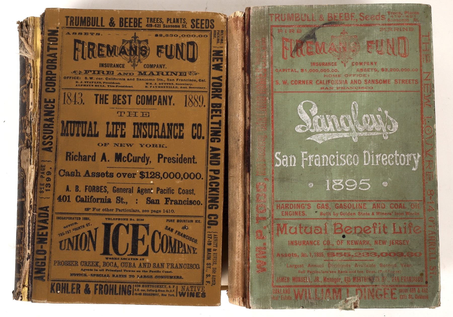 Two volumes of Langley's San Francisco Directory published in 1889 and 1895. Both volumes begin with information about the city's government, fire department, schools, post offices, courts, banks, churches, societies, and military. This information is followed by a street guide and an alphabetical listing of residents, their occupations, and their addresses. There is also a classified business directory at the back of each volume. Business advertisements throughout, some printed in color. 9.25 x 6.25, good condition but 1889 volume covers are detached and 1895 volume is missing original binding.