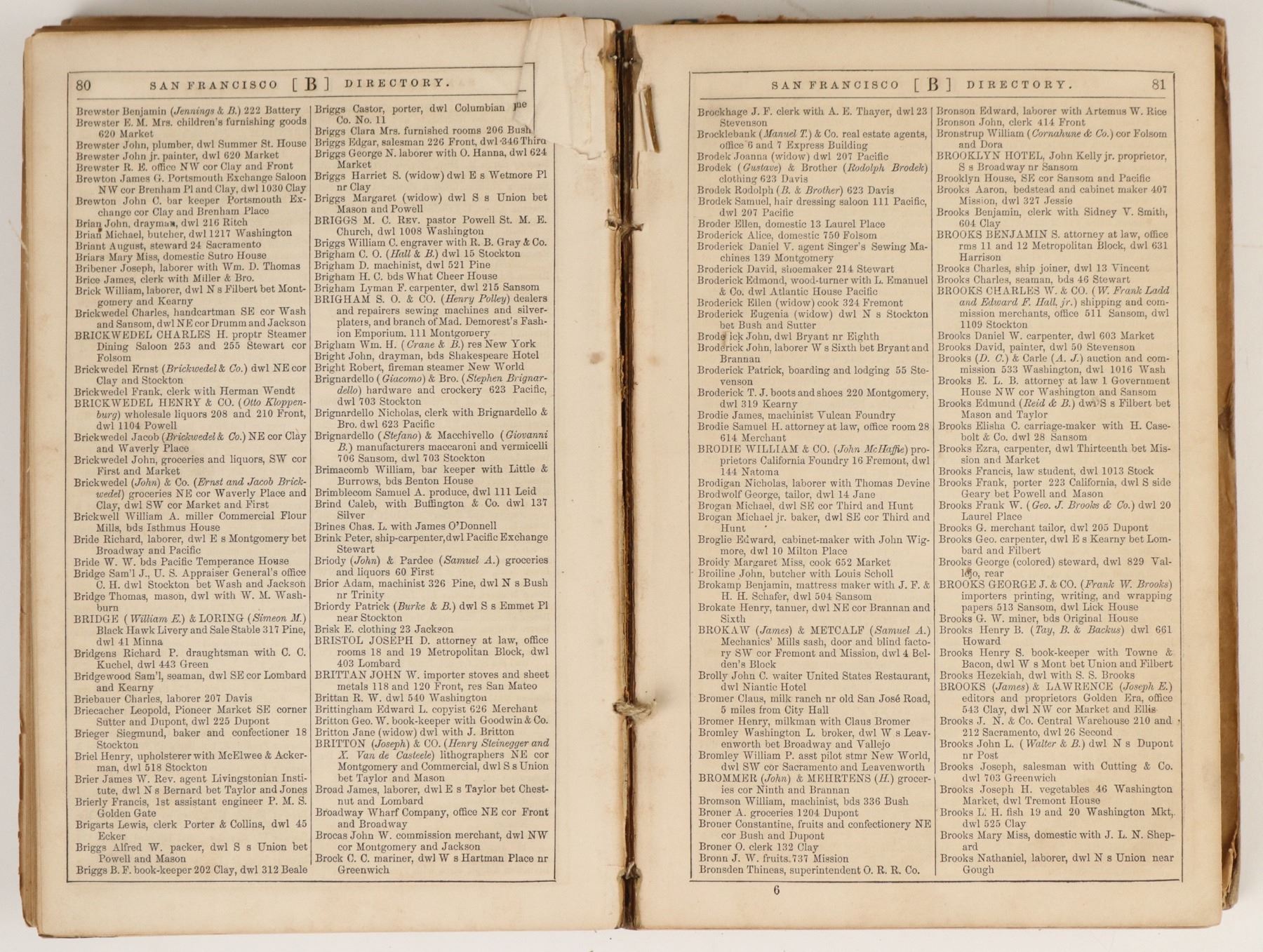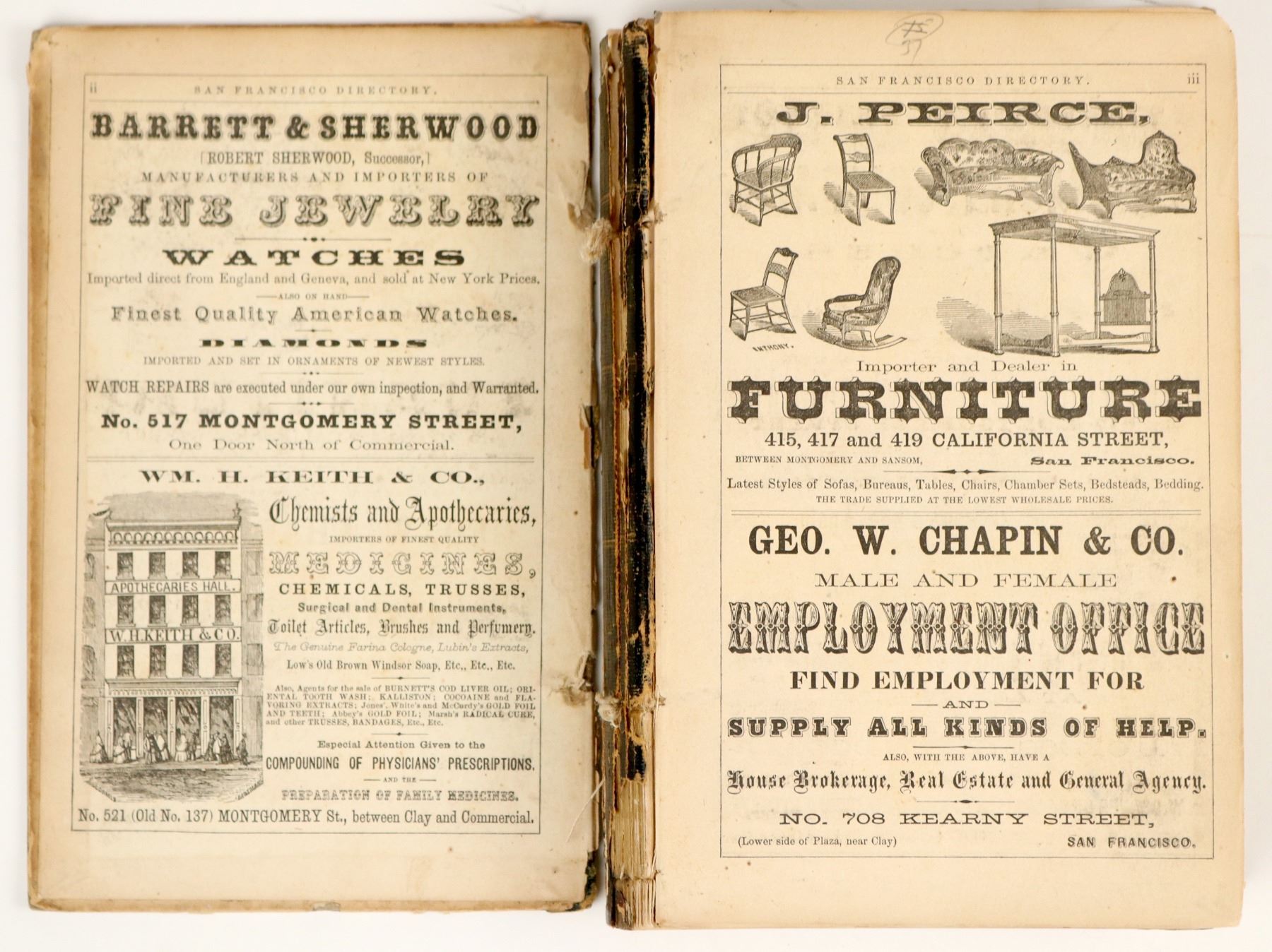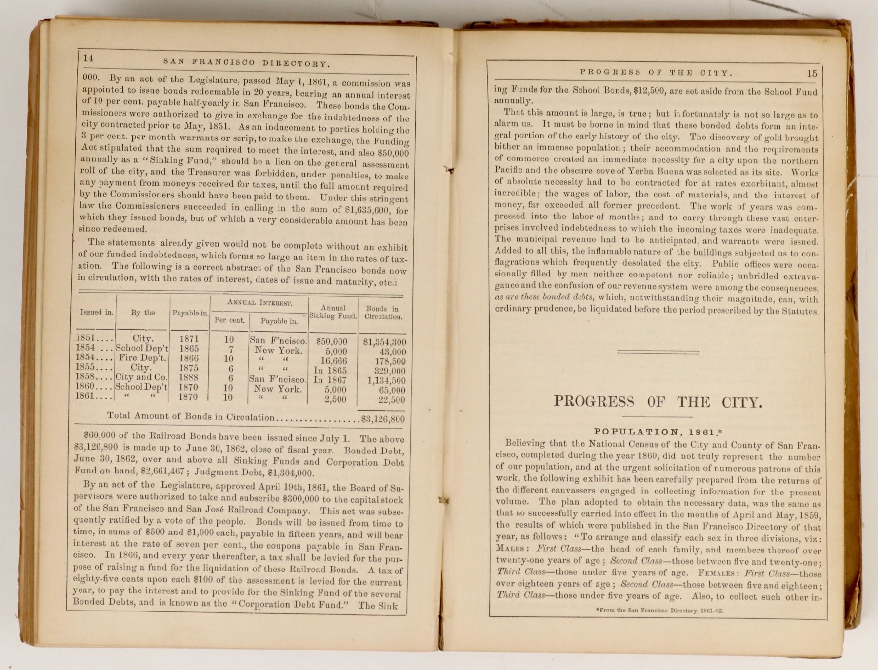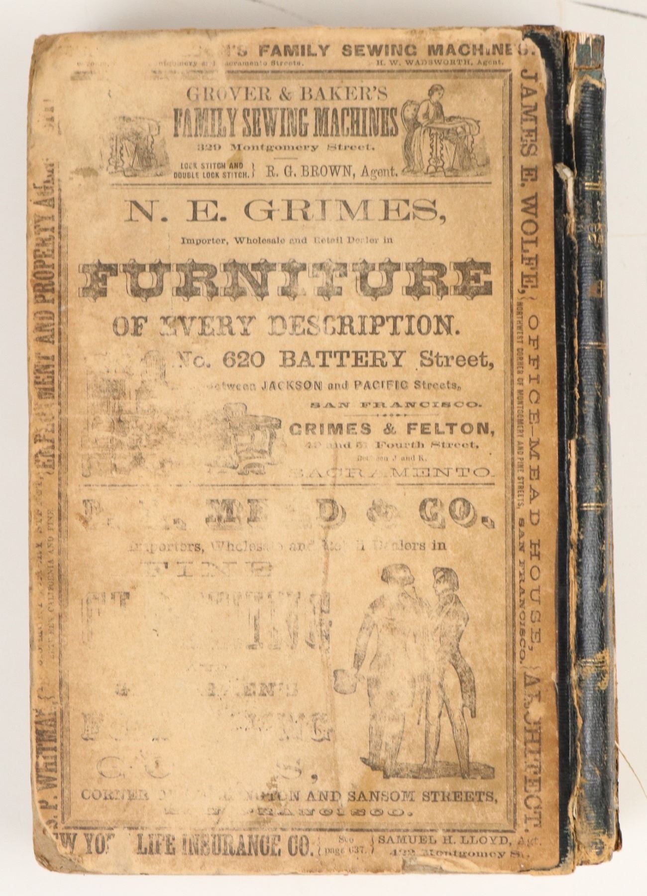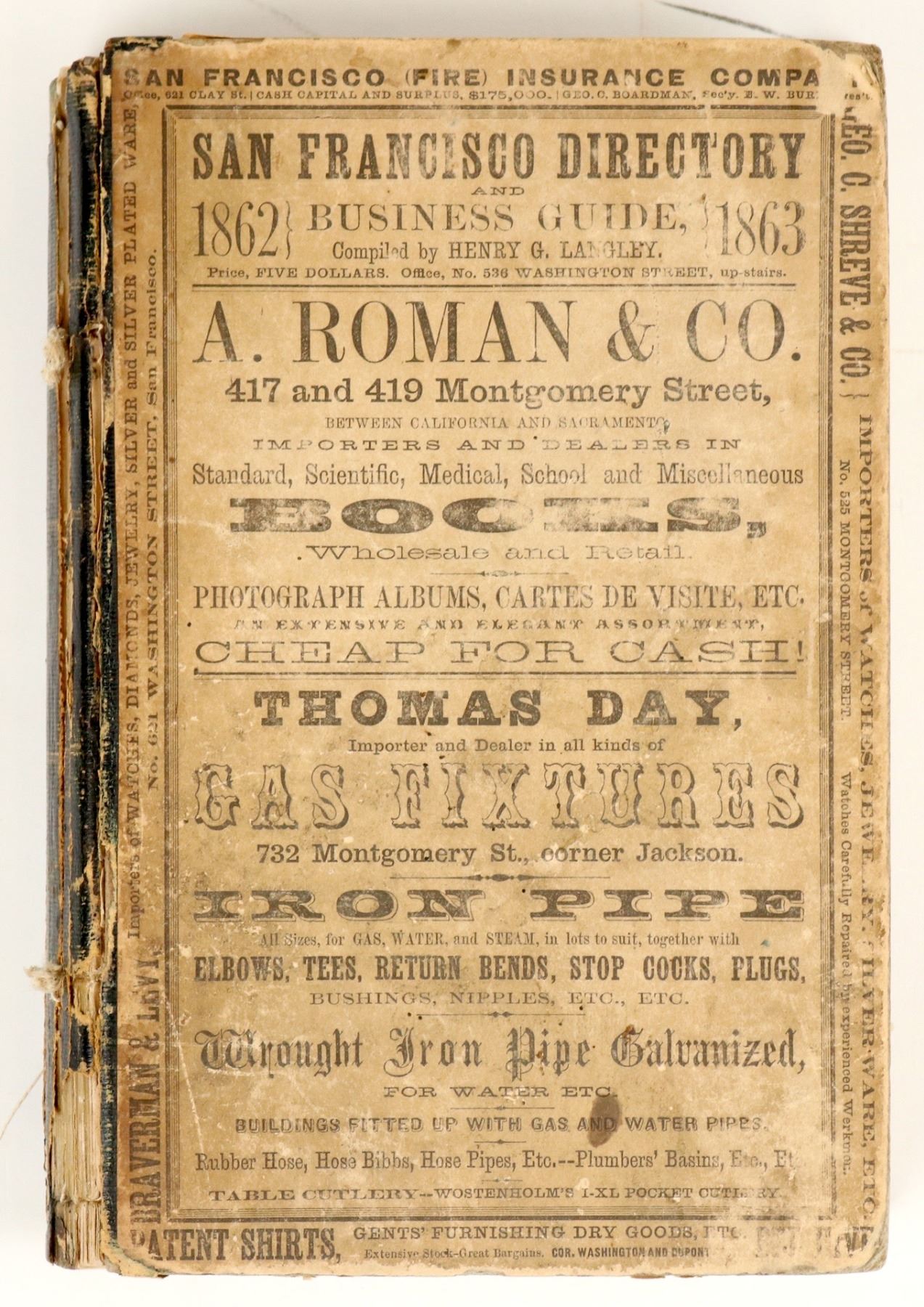 1863 San Francisco directory, compiled by Henry Langley. 639pp. Front board detached, rear board detaching, binding separation at page 80 and 336, spine issues. Still a useful reference, sold as is. Please inspect.